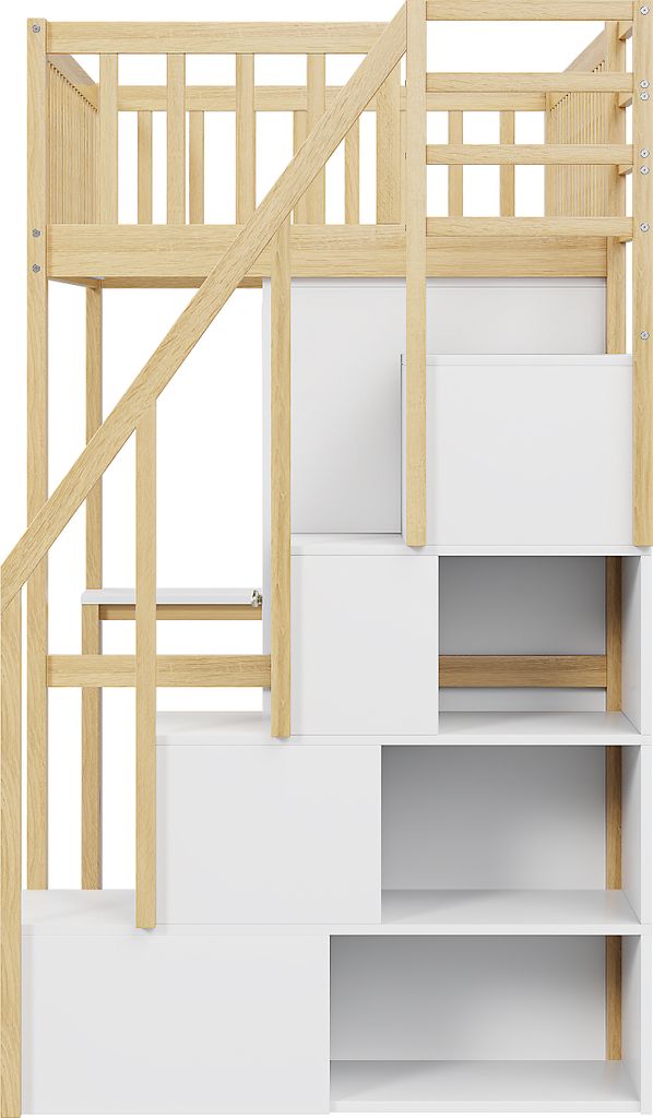 Maximiere den Platz im Kinderzimmer! Dieses Merax Hochbett (90x200cm) hat unten einen integrierten Kleiderschrank und eine Treppe mit Staufächern. Aus massiver Kiefer, weiß lackiert. Tragkraft 120 kg, für Matratzen bis 12 cm Dicke. Mit Schublade und 12 Latten. Maße: 205x126x180 cm. Perfekt für Kinder und Jugendliche - unten kann ein Arbeits- oder Spielbereich entstehen. Montage nötig (ca. 3 Stunden), alles in 4 Paketen. Mach aus jedem Zimmer ein Multifunktions-Paradies!