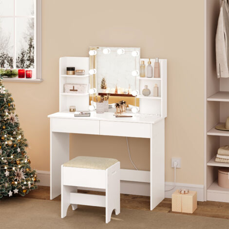 Träumst du von deinem eigenen Beauty-Bereich? Dieser Schminktisch macht deinen Traum wahr! Mit 10 LED-Lichtern, die du in drei Farbtemperaturen einstellen kannst, hast du immer das perfekte Licht für dein Make-up. Kein schlechtes Licht mehr, das die Farben verfälscht! Aber das ist noch nicht alles: Eingebaute Steckdosen mit USB-Anschlüssen laden dein Handy während du deine Haare machst. Zwei geräumige Schubladen und vier offene Fächer bieten Platz für all deine Beauty-Produkte - endlich Ordnung im Chaos! Der passende Hocker ist natürlich inklusive und super bequem. Sogar ein Föhnhalter ist dabei, damit nichts mehr rumliegt. Aufbau? Total einfach! Ohne Werkzeug in wenigen Minuten fertig. Ob morgens vor der Arbeit oder abends für den großen Auftritt - mit diesem Schminktisch startest du perfekt gestylt in den Tag. Weiß lackiert sieht er dazu noch super elegant aus und passt in jedes Zimmer. Einfach hinsetzen, Licht anmachen und sich wie im Beauty-Salon fühlen!