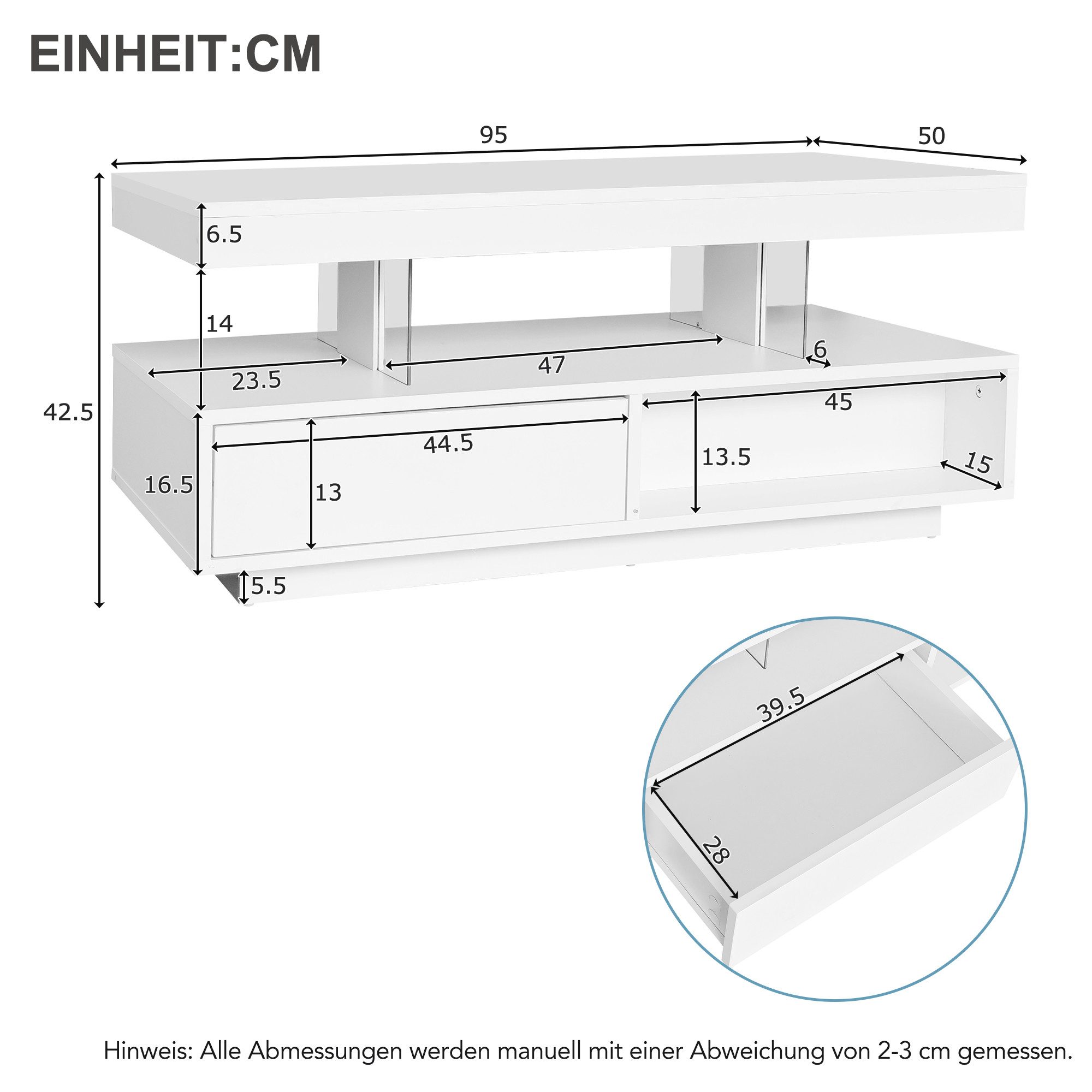 Boah, dieser Couchtisch ist ja mal der Hammer! Der Merax Couchtisch in schickem Weiß bringt modernes Design und coole Technik in dein Wohnzimmer. Mit 100x50x35,5 cm ist er die perfekte Größe für die meisten Sofas. Aber das Beste ist die LED-Beleuchtung - die kannst du per App steuern! Einfach QR-Code scannen, App runterladen und schon kannst du Farben, Helligkeit und sogar Lichtmodi ändern. Party-Stimmung? Einfach den Musik-Modus aktivieren! Du hast zwei praktische Schubladen für Fernbedienungen, Zeitschriften und Kleinkram, plus ein offenes Fach in der Mitte für Bücher oder Deko. Die Glasplatte oben gibt dem ganzen noch mal diesen hochwertigen Look und ist super easy zu reinigen. Aus stabilem Spanplatten-Material gebaut, hält der Tisch bis zu 35 kg aus. Der Zusammenbau ist kein Hexenwerk - Anleitung und alles nötige Material liegt bei. Perfekt fürs Wohnzimmer, aber auch im Schlafzimmer oder Home-Office macht er was her. Stell dir vor: Gemütlicher Filmabend mit angenehmem, dimmbarem Licht - einfach traumhaft! Mit diesem Tisch wird dein Wohnzimmer sofort zum Hingucker. Technik-Freunde und Design-Liebhaber - hier werdet ihr beide glücklich!