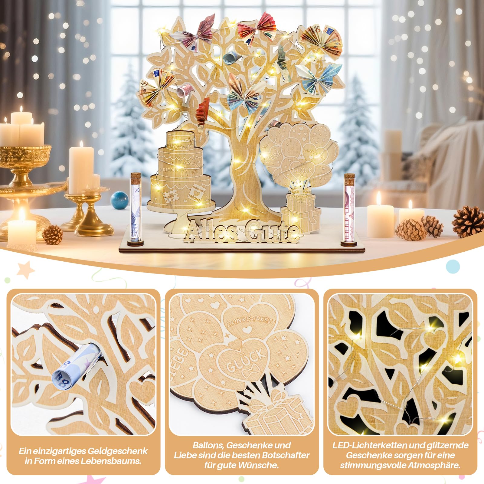 Boah, dieser Geldbaum von FTUREERA ist ja mal eine richtig coole Idee für Geldgeschenke! Statt langweiligen Umschlägen gibts hier einen ganzen Lebensbaum mit LED-Lichterkette der richtig was hermacht. Du kannst das Geld einfach in die Äste stecken oder mit den beiliegten Grußkarten personalisieren. Im Set ist alles dabei: Bodenplatte, Baum-Aufsatz, Ballons, Kuchen-Deko und diese süße Lichterkette die für mega Stimmung sorgt. Perfekt für Hochzeiten, Geburtstage, Abschlussfeiern - einfach für jeden besonderen Anlass. Damit machst du definitiv mehr her als mit nem normalen Umschlag! Einfach aufbauen, Geld rein und staunen lassen.
