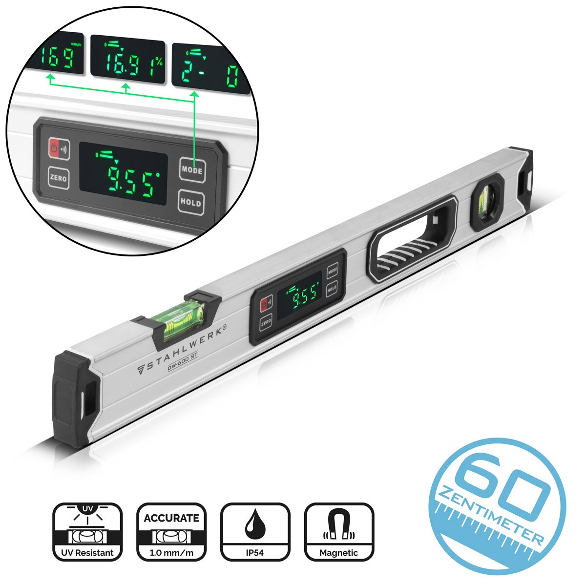 Also, diese HpLive digitale Wasserwaage ist echt der Hit für alle, die's genau wissen wollen! Mit dem hochauflösenden LCD-Display siehst du sofort, ob alles im Lot ist - und das Display dreht sich automatisch, egal aus welchem Winkel du guckst. Die misst Winkel von 0-90° mit einer Genauigkeit von 0,05°, das ist schon richtig professionell. Aus robuster Aluminiumlegierung gefertigt, hält die was aus. Unten sind starke Magnete dran, super praktisch für Metalloberflächen - einfach dranhalten und freihändig arbeiten. Du kannst sie auf drei Arten nutzen: digital, mit der horizontalen oder vertikalen Wasserwaage. Selbst ohne Strom geht's also weiter. Die Datenspeicherung ist mega praktisch, um wichtige Winkelwerte festzuhalten. Mit IP54 ist sie staub- und spritzwassergeschützt, hält also auch mal was aus. Ob auf der Baustelle, in der Werkstatt oder beim Heimwerken - diese Wasserwaage macht einfach Spaß! In 200mm, 300mm, 400mm oder 600mm Länge erhältlich, für jeden Einsatzzweck die passende Größe. Einfach ein cleveres Tool, das die Arbeit leichter macht.