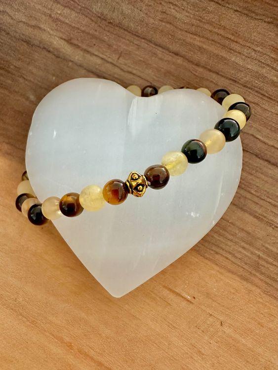 Dieses wunderschöne Naturstein-Armband kombiniert die kraftvollen Eigenschaften von Obsidian, Tigerauge und Magnetsteinen. Jeder Stein ist handpoliert und behält seine natürliche Textur - einfach einzigartig! Der dehnbare Cord passt sich jedem Handgelenk zwischen 18-19cm an und liegt super angenehm. Mit nur 20g Gewicht merkst du das Armband kaum, aber die positive Wirkung umso mehr. Perfekt für Business-Outfits genauso wie für die Freizeit. Wird mit einer hübschen Geschenkkarte (7,5x7,5cm) geliefert - ideal als besonderes Geschenk für beste Freunde, Väter oder Partner zu Geburtstagen, Weihnachten oder einfach als Glücksbringer für den Alltag.