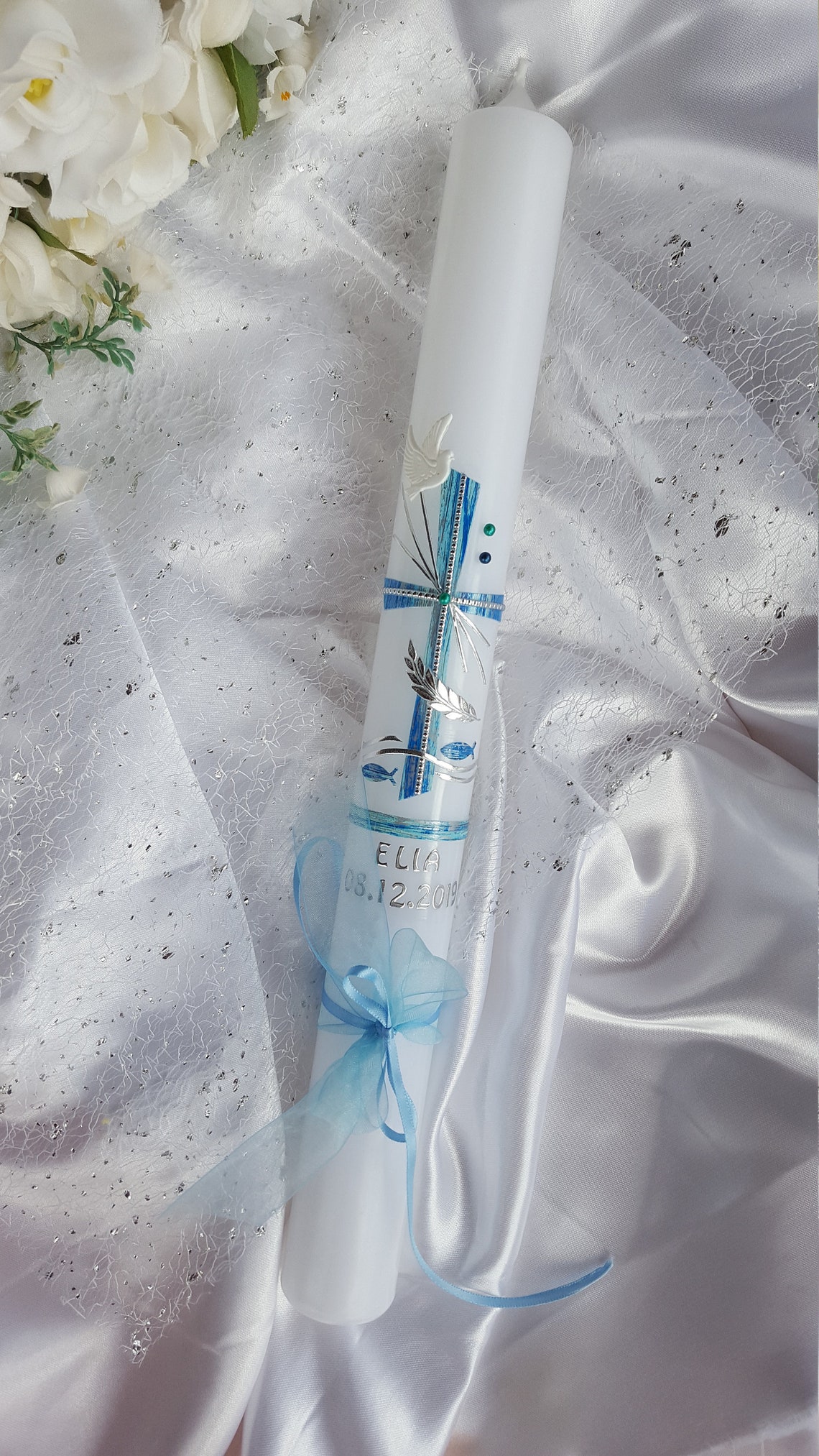 • Taufkerze Mit Patenkerzen - Hellblau-silberne Kommunionkerze 25cm Mit Beschriftung