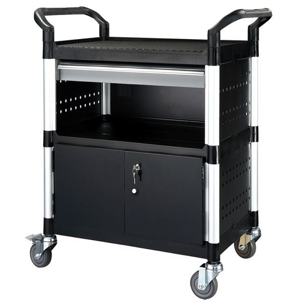 Hey, dieser Servicewagen von FIHUTED ist echt praktisch! Mit Maßen von 101,9 x 48,8 x 97,8 cm - richtig geräumig. Drei Etagen bieten viel Platz für alles Mögliche. Aus robustem Kunststoff - hält was aus in Büro, Lager oder Gastronomie. Abschließbar - deine Sachen sind sicher. Mit feststellbaren Rädern - bleibt stehen, wo du willst. Und die Räder sind super leise - kein störendes Geratter. Montage ist easy - mit beiliegendem Gummihammer schnell zusammengebaut. Perfekt für Restaurant, Hotel, Büro oder auch zu Hause. Ein echter Allrounder, der das Leben leichter macht!