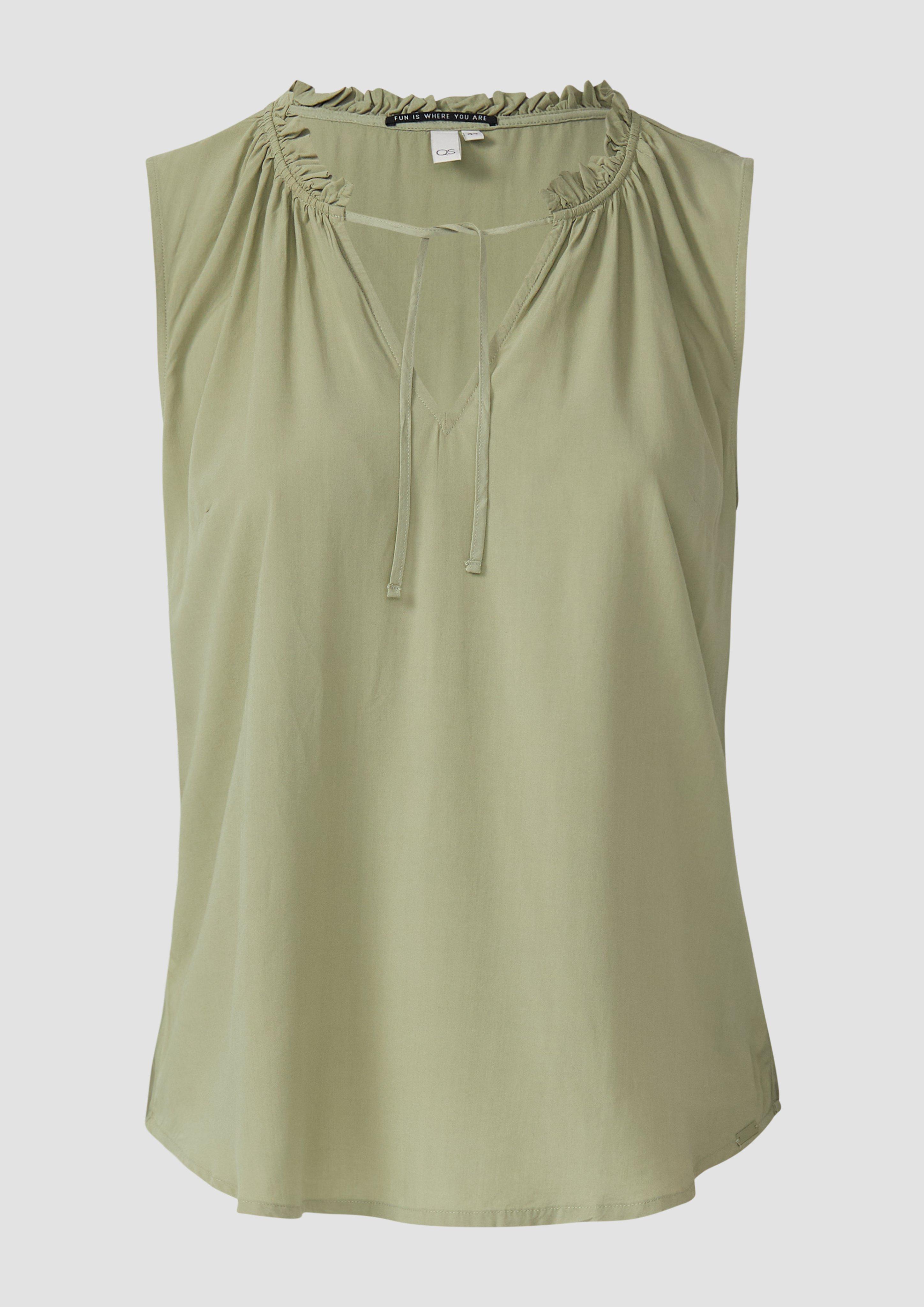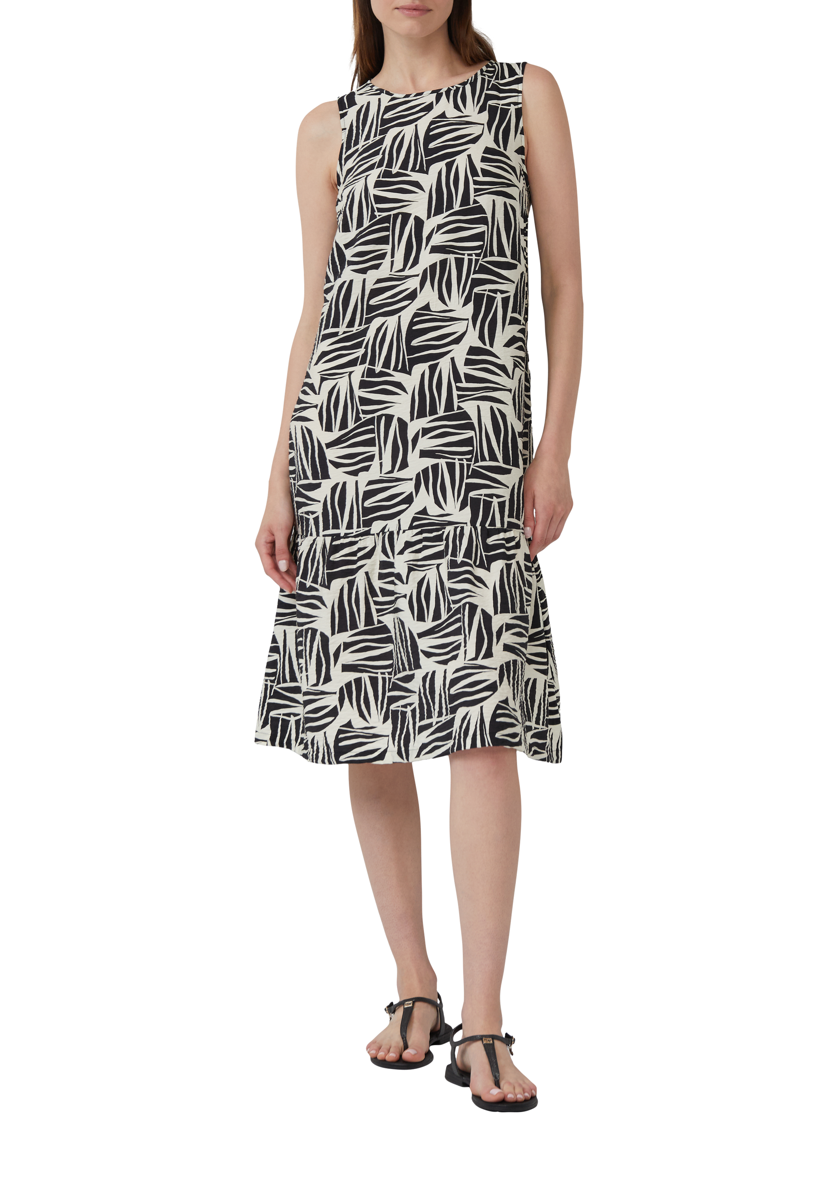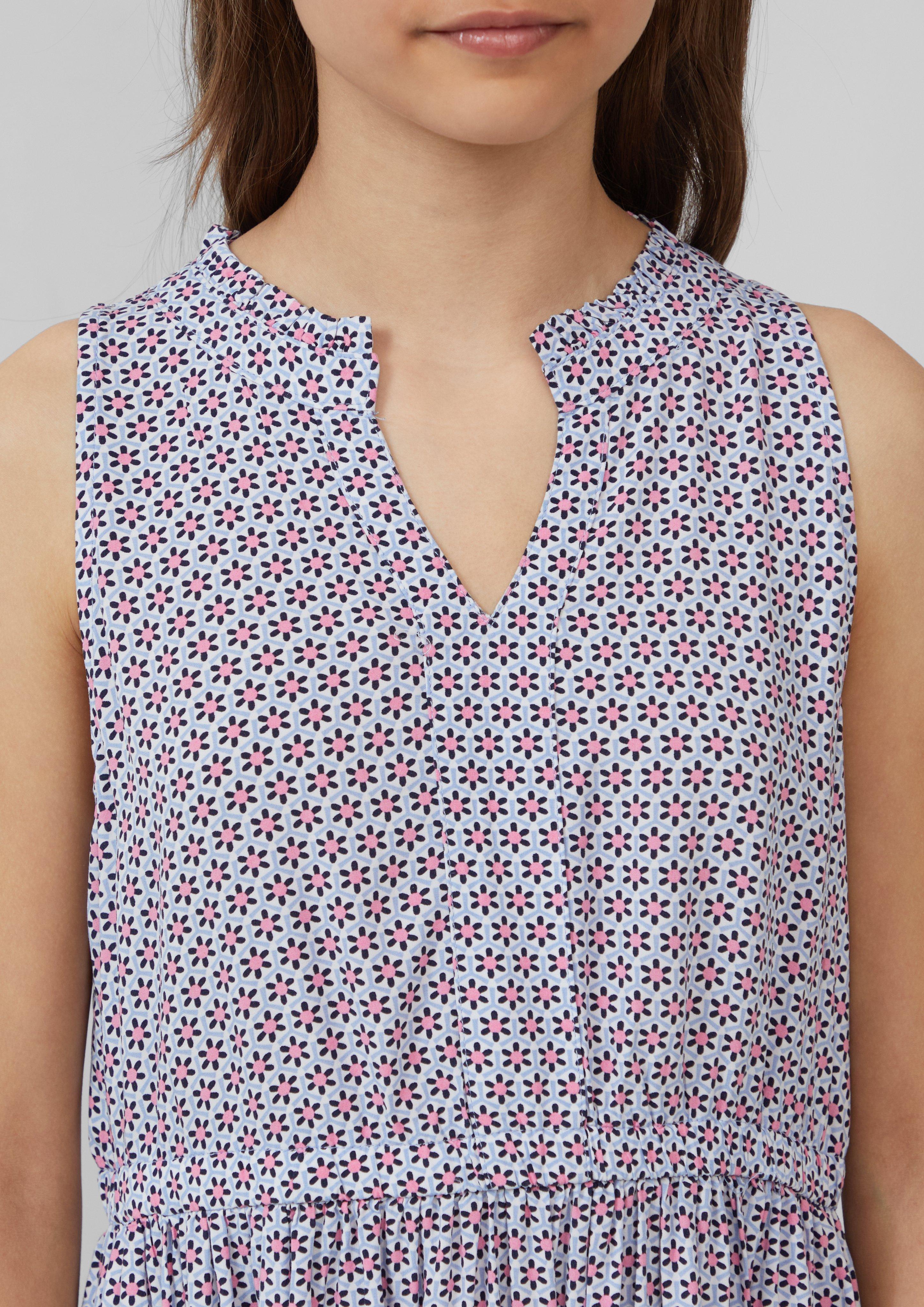 Wow, dieses s.Oliver Kleid ist einfach traumhaft! Aus weicher Viskose gefertigt, liegt es super angenehm auf der Haut. Der ausgestellte Schnitt ist mega schmeichelhaft für jede Figur, und das allover Muster gibt dem ganzen noch mehr Pep. Der Rüschenkragen und der V-Ausschnitt sind echte Hingucker, dazu kommt ein dekorativer Schlitz mit Knopf-Detail. Der elastische Bund sorgt für perfekten Sitz ohne zu drücken. Ärmellos, also super für warme Tage oder zum Kombinieren mit Jacken und Cardigans. Ob für den Büroalltag, einen romantischen Abend oder besondere Anlässe - mit diesem Kleid machst du immer eine gute Figur. Einfach überziehen und strahlen - mehr Style geht kaum!