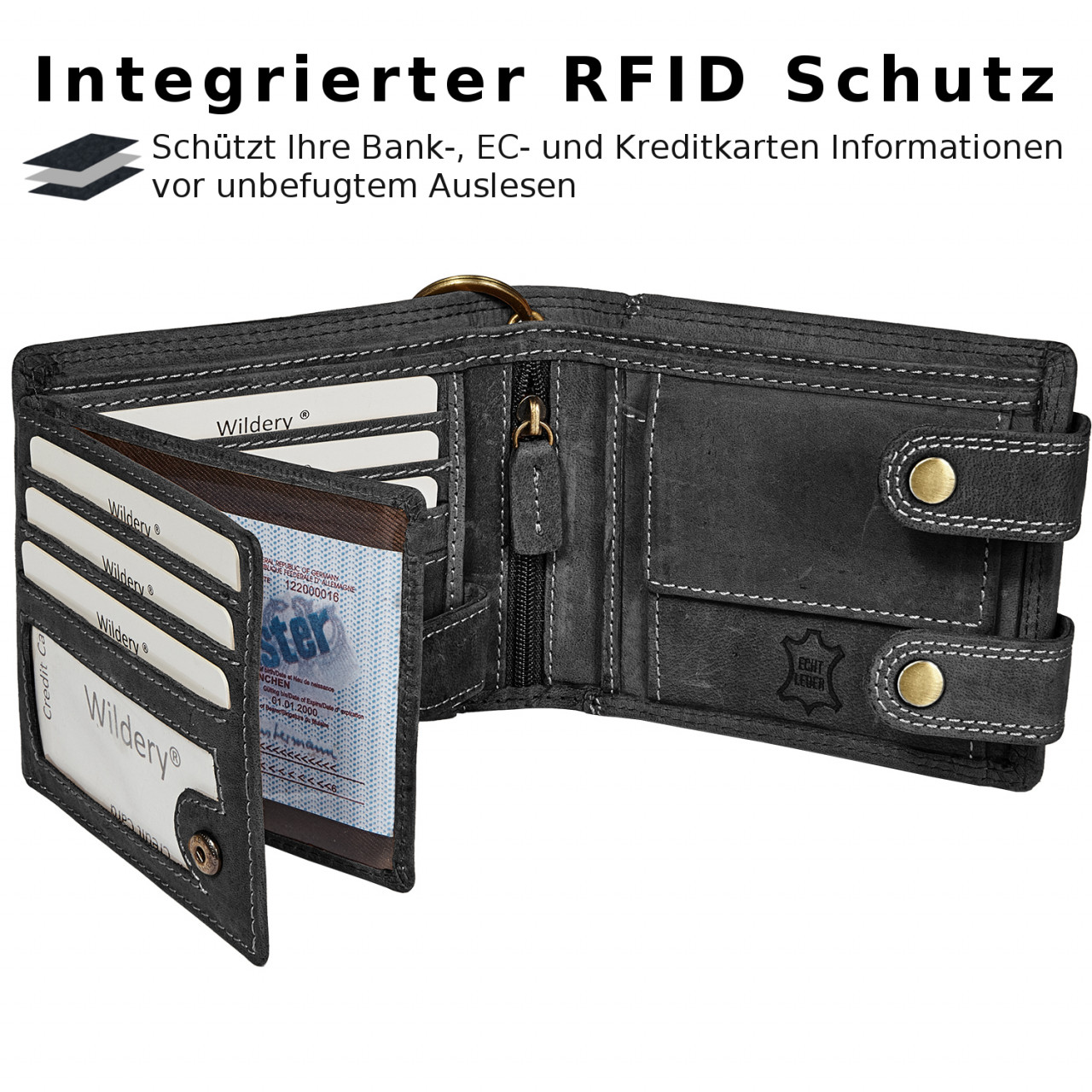 Stylish und sicher - dieses Voll-Rindleder-Etui schützt deine Karten doppelt gut! Das graue Vintage-Design sieht nicht nur klasse aus, sondern bietet auch 6 praktische Fächer: 3 für Kreditkarten, 2 große Einsteckfächer (eins mit Netzfolie für den Ausweis) und ein extra Fach für Belege. Der eingebaute RFID & NFC Schutz blockiert zuverlässig Daten-Diebstahl - vom TÜV Saarland geprüft und zertifiziert! Aus naturbelassenem, geöltem Rindleder gefertigt, wird es mit der Zeit noch schöner. Mit den Maßen 9x1x12cm passt es perfekt in jede Jackentasche. Ideal für unterwegs, auf Reisen oder fürs Auto. Die genähten Fächer garantierte Langlebigkeit. Ein echtes Qualitätsprodukt, das deine wichtigen Karten sicher verwahrt!