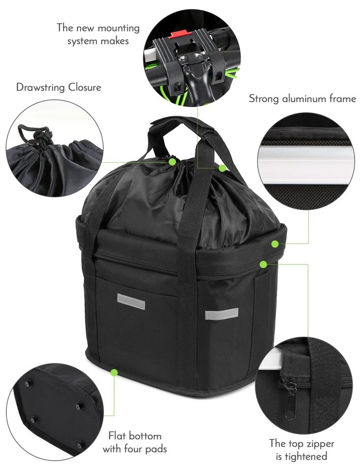 Dein neuer bester Freund für alle Fahrrad-Touren! Dieser faltbare Fahrradkorb aus wasserdichtem Oxford-Gewebe ist einfach genial. In nur 10 Sekunden am Lenker befestigt - dank cleverem Schnellverschluss-System. Und wenn du ankommst, nimmst du ihn einfach ab und hast einen praktischen Tragekorb. Super für Einkäufe, aber auch perfekt für deinen kleinen Hund (bis 11 lbs). Mit 35,5x23,3x25 cm ist er groß genug für alles, was du so brauchst: Laptop, Einkäufe, sogar Camping-Ausrüstung. Die Regenhaube schützt bei plötzlichem Schauer, und der Kordelzug-Verschluss sorgt dafür, dass nichts rausfällt. Innen findest du praktische Reißverschluss-Fächer für Wertsachen, außen Steckfächer für Schlüssel oder Karten. Wenn du ihn nicht brauchst, faltest du ihn einfach flach zusammen - spart 90% Platz! Der Aluminium-Rahmen ist leicht aber stabil, der EVA-Griff liegt gut in der Hand. Ob Pendeln, Einkaufen, Camping oder mit dem Hund unterwegs - dieser Korb ist immer dabei. Einfach den Abstand zwischen Lenker und Vorderrad checken (mindestens 25 cm), dann passt er zu den meisten Fahrrädern!