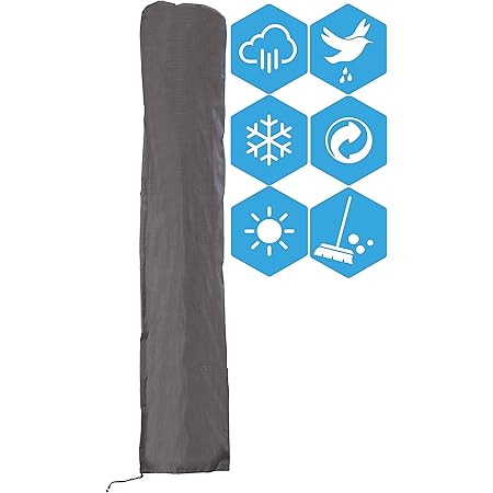 Dein Sonnenschirm verdient den besten Schutz! Diese robuste Schutzhülle aus 210D Oxford-Gewebe bewahrt deinen Schirm vor Regen, Schnee, Staub und UV-Strahlung. Mit dem praktischen Reißverschluss lässt sich die Hülle leicht öffnen und schließen, während der verstellbare Kordelzug am unteren Ende für zusätzlichen Windschutz sorgt. Die wasserdichte Beschichtung und speziell versiegelten Nähte halten selbst bei starkem Regen alles trocken. Die Hülle passt für die meisten Außenschirme, Bananenschirme und Ampelschirme mit 2-3m Durchmesser. Einfach über den zusammengeklappten Schirm stülpen, Reißverschluss zu, Kordelzug festziehen - fertig! So bleibt dein Schirm auch außerhalb der Saison in Top-Zustand. Die Reinigung ist supereinfach: Mit einem feuchten Tuch abwischen oder bei Bedarf in der Sonne trocknen lassen. Wenn du die Hülle nicht brauchst, lässt sie sich platzsparend verstauen. Investiere in den Schutz deines Schirms und verlängere seine Lebensdauer - dein Schirm wird es dir danken!