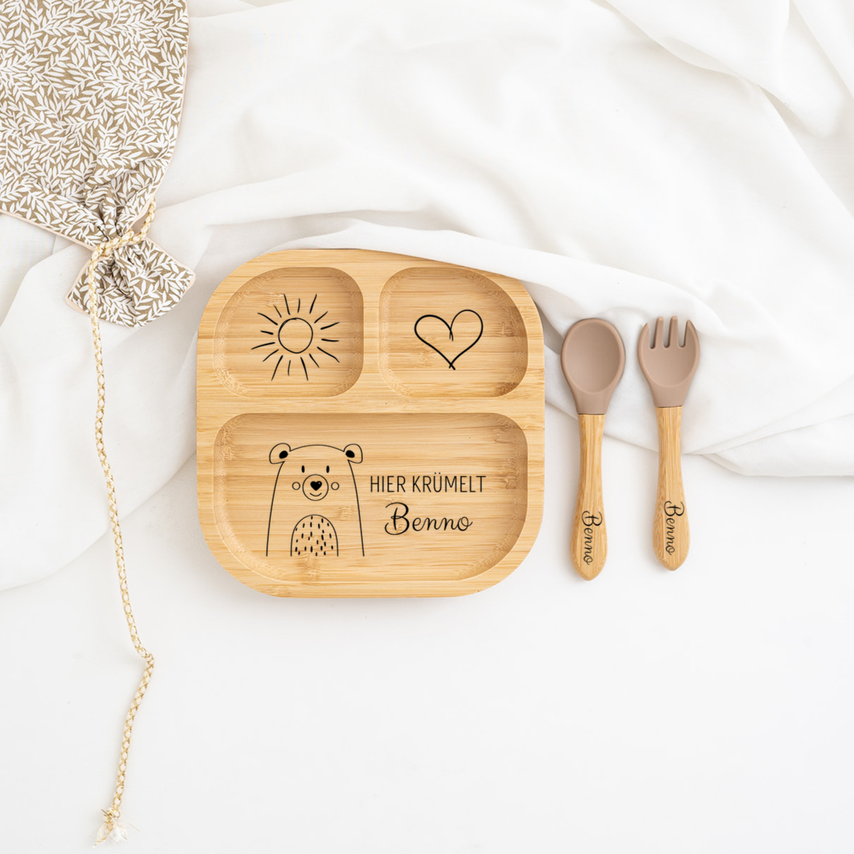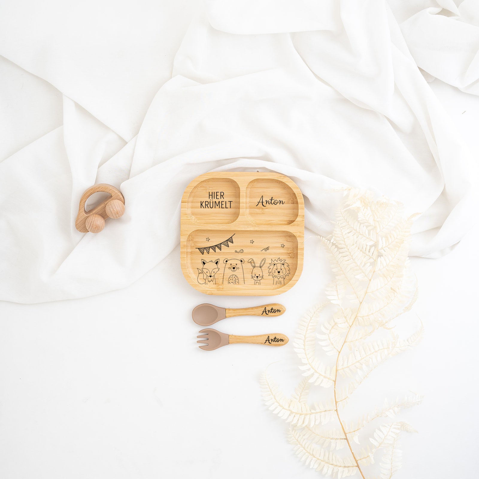 So macht Essen lernen Spaß! Dieser personalisierte Bambus-Teller wird mit dem Namen deines Kindes graviert - ein richtig persönliches Geschenk zur Geburt oder Taufe. Der Teller hat drei praktische Fächer für verschiedene Leckereien und einen starken Saugnapf, der wirklich hält! Kein Umkippen mehr, weniger Kleckerei - sowohl am Hochstuhl als auch am Esstisch. Perfekt für Baby-led Weaning, wenn die Kleinen selbst entdecken wollen. Aus 100% natürlichem Bambus, BPA-frei und super pflegeleicht - einfach per Hand abwaschen (der Saugnapf ist spülmaschinengeeignet). Hergestellt wird jedes Set mit Liebe in Hamburg von einem Familienunternehmen. Ein Unikat, das jahrelang Freude macht und zu einer schönen Erinnerung wird!