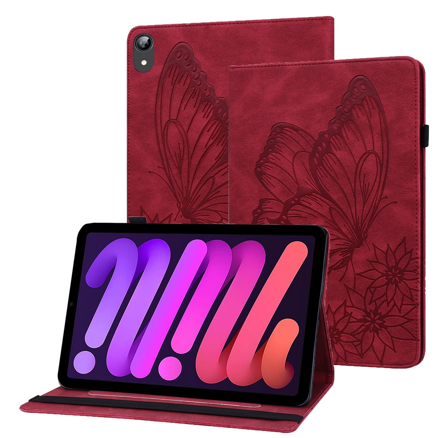 Dein iPad mini 6 (2021, 8.3 Zoll, A2568) verdient den besten Schutz! Diese wunderschöne Hülle mit geprägtem Schmetterling-Motiv ist nicht nur hübsch, sondern auch mega praktisch. Aus hochwertigem PU-Leder außen und weicher TPU-Innenschale schützt sie zuverlässig vor Kratzern und Stürzen. Das Besondere: Zwei integrierte Anti-Rutsch-Riemen sorgen für stabilen Stand im Quer- und Hochformat - perfekt zum Videos schauen oder surfen! Und als ob das nicht genug wäre: Es gibt sogar ein Kartenfach für deine Kreditkarten und Bargeld. Der elastische Verschlussband ersetzt lästige Magnetverschlüsse - sicher und praktisch. In Rot und anderen schönen Mustern erhältlich - auch als Geschenk super geeignet! Mach dein iPad nicht nur sicher, sondern auch stylisch!