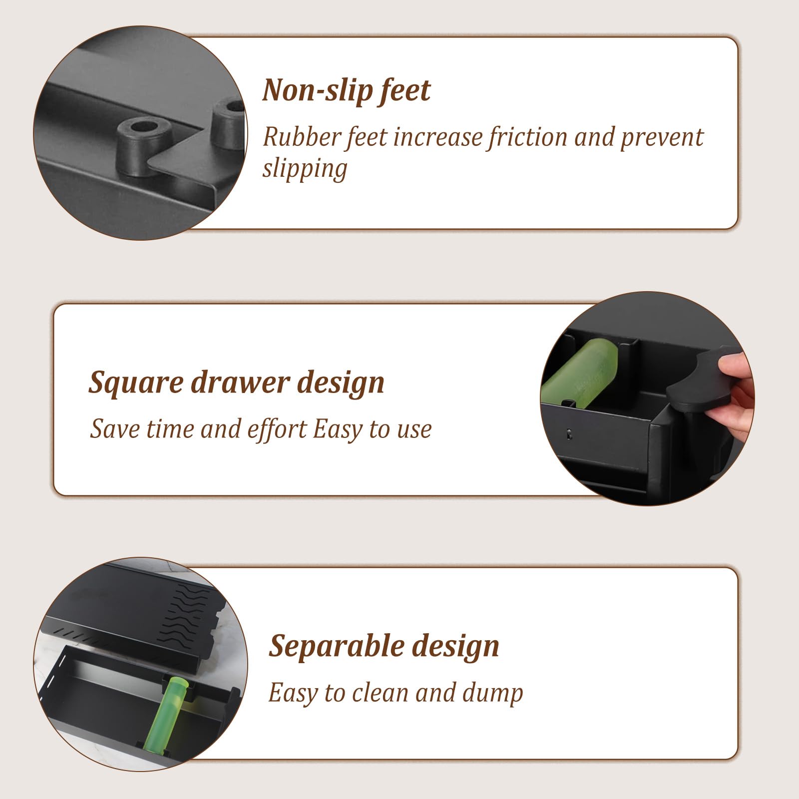 Die ultimative Klopfbox für deine Kaffee-Ecke! Endlich Ordnung beim Espresso machen - die praktische Schublade fängt den Kaffeesatz sauber auf und lässt sich ganz einfach entleeren. Einfach die Kaffeemaschine draufstellen und schon sparst du Platz auf der Arbeitsfläche. Die integrierte Silikon-Tampermatte ist super praktisch: Kaffeepulver verteilen, festdrücken und den Siebträger sauber abklopfen - alles an einem Platz! Die Lüftungslöcher an den Seiten sorgen dafür, dass sich keine Hitze staut. Der Gummischlagstab ist genial - kaum Geräusche beim Klopfen und dein Siebträger bleibt geschont. Die rutschfesten Füße geben sicheren Stand. Sieht super aus in jeder Küche, ob daheim, im Büro oder im Café - dieses Teil macht einfach alles besser! Edelstahl-Oberfläche ist robust und leicht zu reinigen. Dein neuer liebster Helfer für die tägliche Kaffee-Routine!