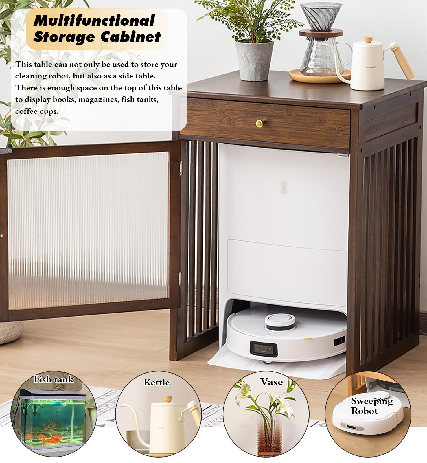 Stell dir vor: Dein Saugroboter hat endlich sein eigenes Zuhause! Kein Stolpern mehr über das Gerät, kein Staub auf dem Roboter, und alles sieht ordentlich aus. Die Rattantüren sehen nicht nur super aus, sondern sorgen auch für genug Luftzirkulation. In der Schublade kannst du gleich das ganze Zubehör verstauen - Ersatzbürsten, Ladekabel und Co. Und oben drauf stellst du deine Lieblingspflanze oder ein paar Bücher. So wird Aufräumen zum Vergnügen!