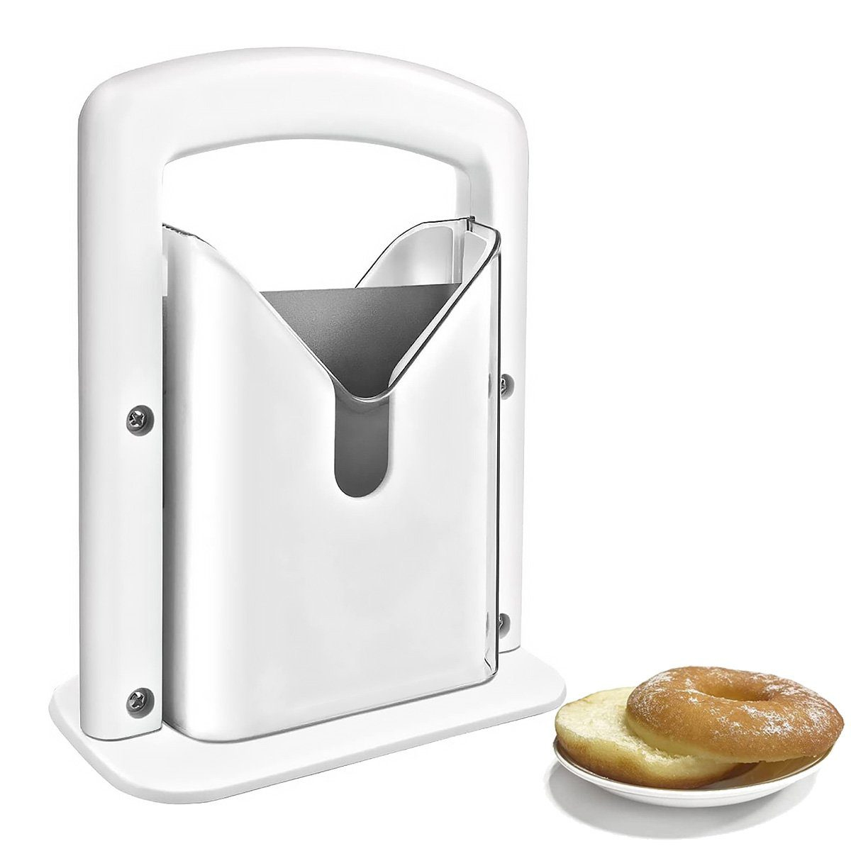Aus Edelstahl und robustem ABS gefertigt, ist der Schneider langlebig und hygienisch. Die gezackten Klingen schneiden mühelos durch Bagels, Muffins und sogar festes Brot.