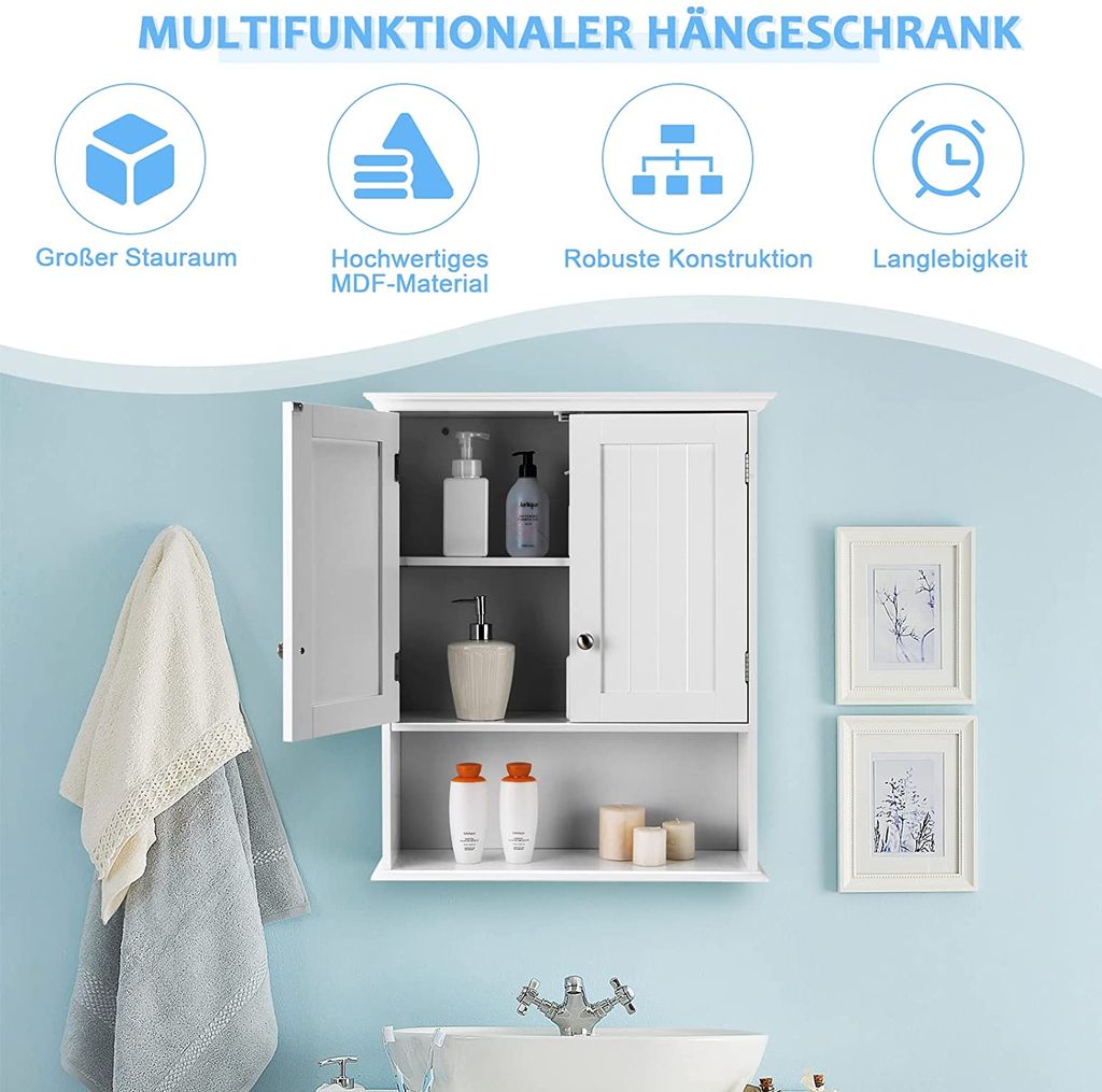 Endlich Ordnung im Bad! Dieser GIANTEX Hängeschrank kombiniert praktischen Stauraum mit einem großen Spiegel - einfach genial. Mit 56x13x58 cm perfekt für kleine Badezimmer, aber trotzdem geräumig genug für all deine Sachen. Der verstellbare Einlegeboden lässt sich individuell anpassen, ob für Shampoo-Flaschen, Cremes oder Zahnputzzeug. Aus robustem MDF gefertigt und feuchtigkeitsresistent - hält also auch mal was aus. Montage ist total easy, alles ist nummeriert und die Anleitung erklärt Schritt für Schritt. Sieht mega modern aus in Weiß und passt in jedes Badezimmer. Unter dem Spiegel ist noch eine offene Ablage für Parfüm oder deine Lieblingskosmetik. So hast du alles im Blick und griffbereit. Mach dein Bad zur Wohlfühloase - mit diesem praktischen Spiegelschrank wird aufräumen zum Kinderspiel!