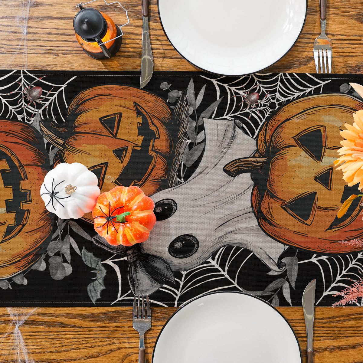 Perfect für gruselige Halloween-Partys! Dieser Tischläufer von DOKRIN ist 45x183 cm groß und passt auf die meisten Esstische. Aus 100% knitterfreiem Polyester - leicht, langlebig und lichtbeständig. Mit schwarzen Spinnweben und zarter Spitze verziert, sieht einfach authentisch gruselig aus. Im Set sind 6 schwarze Spinnen dabei, die du selbst platzieren kannst. Ob auf dem Tisch, über dem Kamin oder als Türdekoration - dieser Läufer macht überall was her. Schafft sofort die perfekte Halloween-Atmosphäre. Auch für Thanksgiving oder andere Feiern geeignet. Einfach auslegen und die Gäste gruseln!