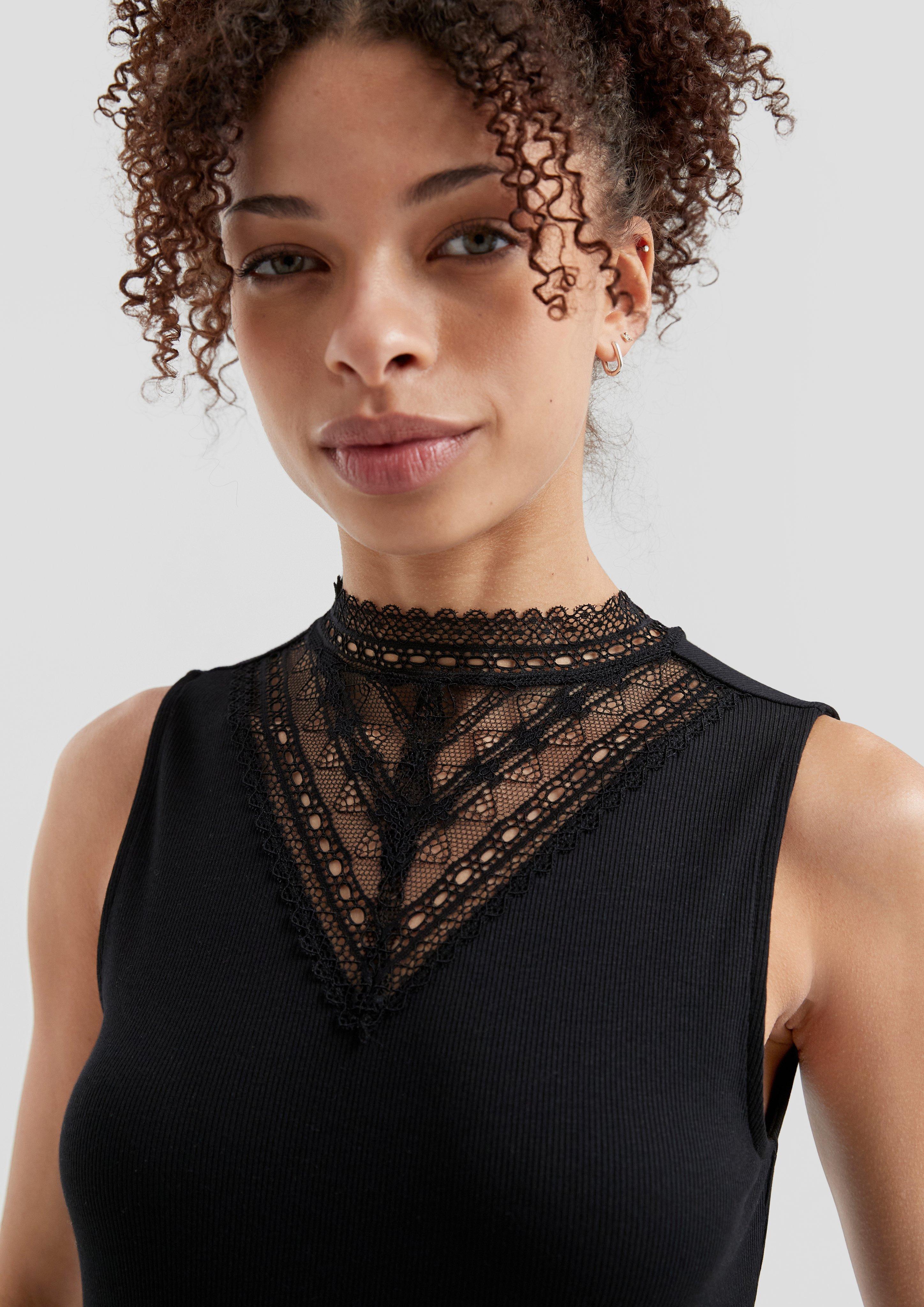 Wow, dieses Ripptop mit dem coolen Spitzeneinsatz wird dein neuer Liebling! Der Slim Fit sitzt einfach perfekt und betont deine Figur - super für lässige Tage oder wenn du mal wieder ausgehst. Der Stehkragen gibt dem ganzen noch 'nen modernen Touch, und die Rippware macht's super bequem. \\n\\nDie halblange Länge ist genau richtig: nicht zu kurz, nicht zu lang. Perfekt zu Jeans, Röcken oder auch mal zu 'ner coolen Hose. Das Beste? Du fühlst dich den ganzen Tag wohl und siehst trotzdem stylisch aus. \\n\\nOb im Büro, an der Uni oder beim Café-Besuch - dieses Top passt einfach immer. Der Spitzeneinsatz ist ein richtig schönes Detail, das das ganze Teil aufwertet. Aus weicher, dehnbarer Rippware gemacht, die sich super anfühlt. \\n\\nWichtig: Läuft nicht ein und behält seine Form - was will man mehr? Einfach anziehen und strahlen! Perfekt für alle, die's lässig mögen, aber trotzdem nicht auf Style verzichten wollen. Absoluter Must-Have für deinen Kleiderschrank!