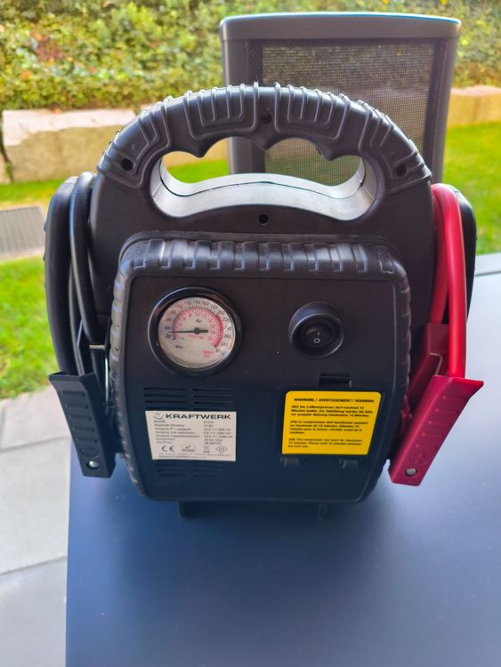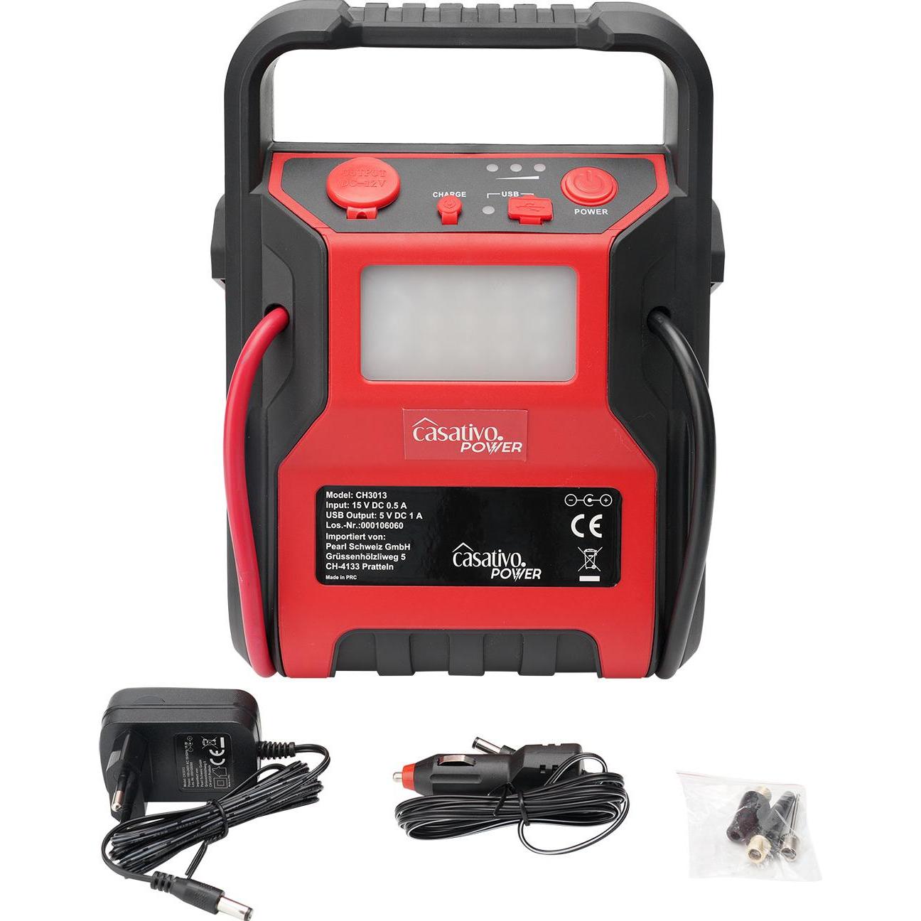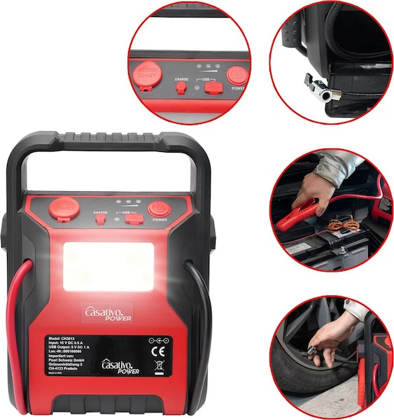 Dieses Teil ist der absolute Alleskönner für jedes Auto! Die Casativo Powerbank kombiniert fünf wichtige Funktionen in einem robusten Gehäuse. Bei einer leeren Batterie springst du dein Auto einfach selbst an - mit satten 1000A Spitzenstrom packst du auch größere Motoren bis 4,0L Benzin oder 3,0L Diesel.\n\nDer integrierte Luftkompressor mit Manometer pumpt dir Reifen bis 150 PSI auf. Egal ob Auto, Motorrad oder Fahrrad - sogar Luftmatratzen und Bälle bekommst du damit im Nu aufgepumpt. Drei verschiedene Ventiladapter sind natürlich im Lieferumfang dabei.\n\nAls Powerbank mit 20.000 mAh lädst du dein Smartphone und andere USB-Geräte. Der Zigarettenanzünder-Ausgang mit 12V und 204 Watt versorgt sogar deine Kühlbox oder andere 12V-Geräte.\n\nDie helle LED-Arbeitsleuchte mit 100 Lumen leuchtet dir bei Reparaturen oder Pannen den Weg. Und das alles in einem kompakten Paket von 34,5 x 29 x 16 cm mit praktischem Tragegriff.\n\nMitgeliefert werden: Die Powerbank selbst, 230V-Ladekabel, 12V-Kfz-Netzteil und die drei Ventiladapter. Ob für die tägliche Fahrt, Camping-Ausflüge oder als Notfall-Ausrüstung - mit diesem Multitalent bist du immer auf der sicheren Seite!