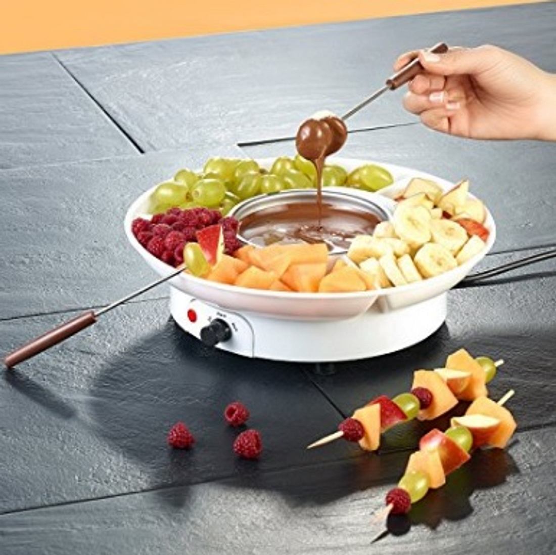 Wow, was für ein geniales Fondue-Set! Perfekt für gemütliche Abende zu zweit oder kleine Partys. Die Keramik-Tasse hat 200ml Fassungsvermögen und wird von einem Teelicht warm gehalten - super einfach! Mit der Edelstahlgabel kannst du Obst, Brot oder Kekse in geschmolzene Schokolade oder Käse tunken. Und das Beste: Alles ist spülmaschinengeeignet und lebensmittelecht. Maße: ca. 11x8,8x12 cm, Gewicht 360g. Ob für Valentinstag, Geburtstage oder einfach so - dieses Set bringt Stimmung auf den Tisch! Die glatte Oberfläche ist leicht zu reinigen und die Kerze sorgt für eine richtig gemütliche Atmosphäre. Einfach die Teekerze anzünden, Schokolade schmelzen und genießen! Das macht jedes Essen zu einem besonderen Erlebnis.