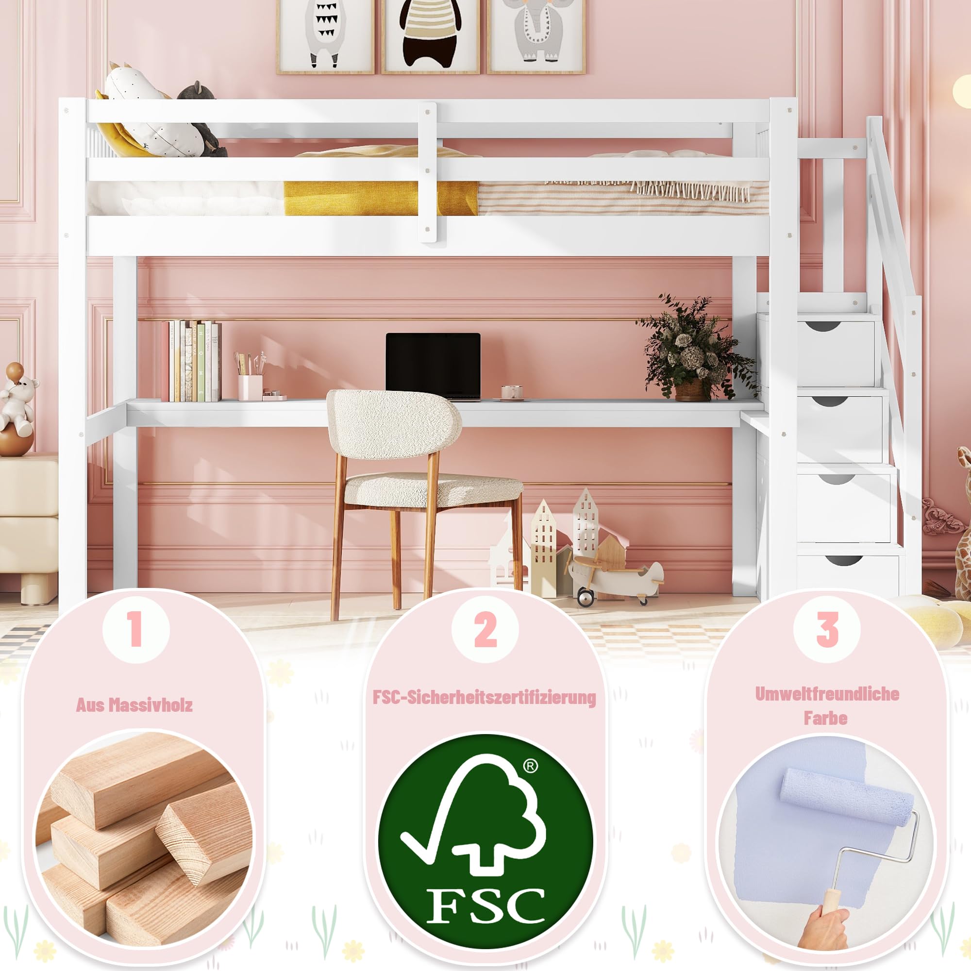 • HYUB Hochbett 140x200cm Mit Treppe - Etagenbett Mit Schreibtisch Und Stauraum