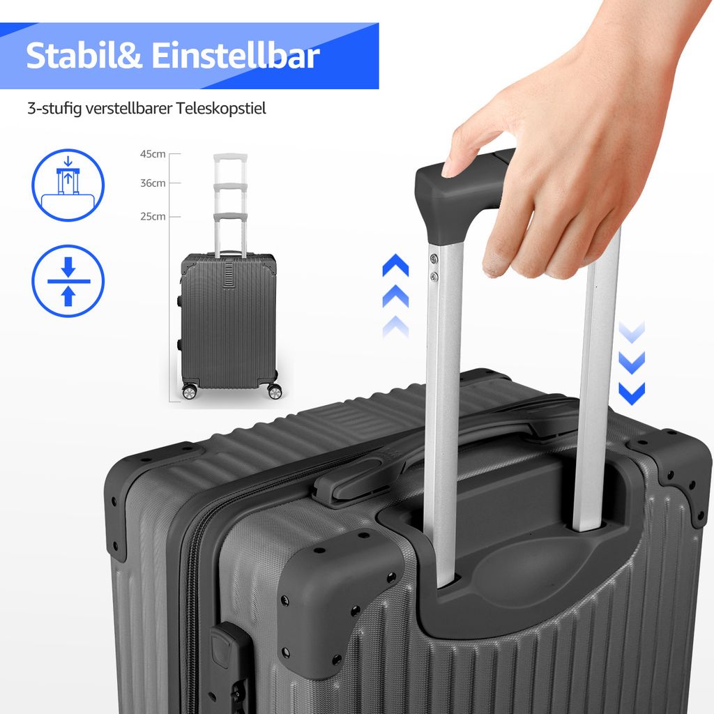 Perfekt ausgestattet für jede Reise! Dieses 4-teilige Kofferset von TIYFIY hat alles, was echte Reiseprofis brauchen. Vier Koffer in verschiedenen Größen: XL (73x45x28cm) für den Familienurlaub, L (65x39x26cm) für 5-7 Tage, M (55x33x23cm) als Handgepäck und S (20x29x15cm) als Kosmetikkoffer. Aus robuster PC-Hartschale mit 360°-Rollen für müheloses Manövrieren. Besonderes Highlight: USB-Anschluss zum Aufladen deiner Geräte, faltbarer Getränkehalter und sicheres TSA-Schloss für internationale Reisen. Die Koffer sind ineinander verstaubar - platzsparend nach der Reise. In schickem Blau erhältlich - dein perfekter Begleiter für Städtetrips, Geschäftsreisen oder den großen Urlaub!