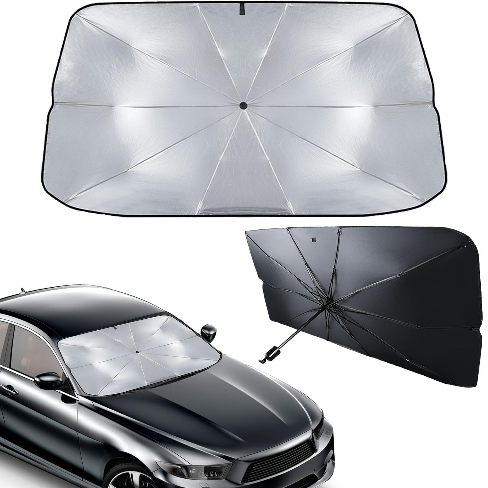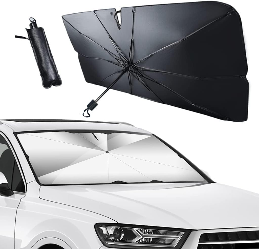 Schütze dein Auto vor der Sommerhitze mit diesem praktischen Sonnenschutz für die Frontscheibe! Mit den Maßen 140x80cm passt er perfekt für die meisten PKW, SUVs und Vans. Einfach wie einen Regenschirm öffnen und hinter die Windschutzscheibe klemmen - schon blockiert er bis zu 99% der UV-Strahlen und verhindert das Aufheizen des Innenraums. Dein Armaturenbrett, Lenkrad und die Sitze bleiben kühl, auch bei praller Sonne. Das robuste Material mit reflektierender Beschichtung und die 10 verstärkten Carbonfaser-Skelette garantieren Langlebigkeit. Besonders praktisch: Der Sonnenschutz lässt sich ganz einfach zusammenfalten und platzsparend im Handschuhfach oder der Tür verstauen. Mit dem praktischen Griff ist die Handhabung super einfach. Die wasserdichte Aufbewahrungstasche inklusive schützt den Sonnenschutz bei der Aufbewahrung. Perfekt für den Sommer, ob beim Einkaufen, im Urlaub oder bei der Arbeit - dein Auto bleibt kühl und die Inneneinrichtung wird vor Sonnenschäden bewahrt. Ein ideales Geschenk für Autofahrer, die ihr Fahrzeug schonen wollen!
