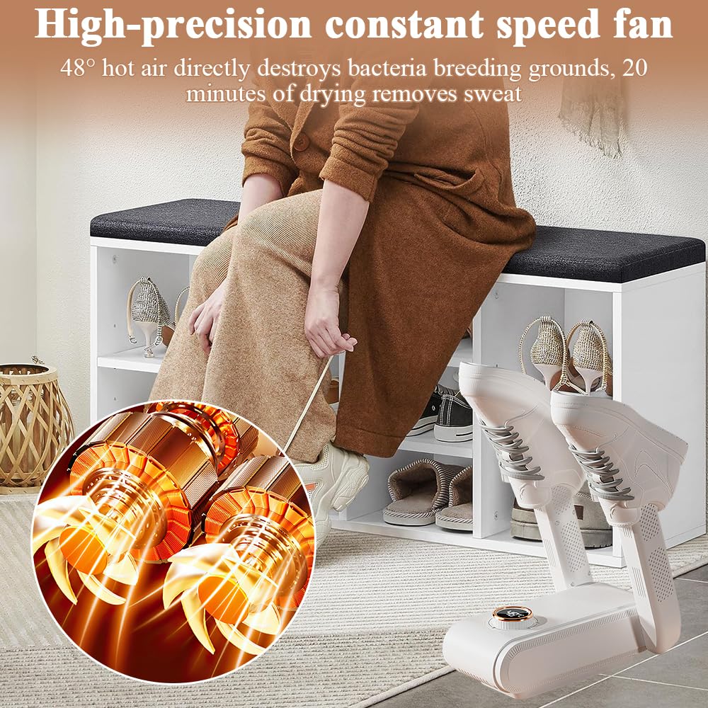 Schluss mit nassen Schuhen! Dieser SKIKHN Schuhtrockner trocknet deine Schuhe, Stiefel und Handschuhe gründlich und schonend. Mit UV-Sterilisation gegen Bakterien und Gerüche. 360°-Warmluftzirkulation für gleichmäßiges Trocknen. Timer mit 30/60/90/120 Minuten Einstellung. Sanfte 48°C Temperatur schont das Material. Leiser Betrieb, perfekt für Zuhause und Reisen. Maße: 26,8x18,2x9,6 cm, 600 g Gewicht. Ob Sportschuhe, Skischuhe oder Alltagsschuhe - nach Regen oder Sport sind sie schnell wieder trocken und frisch!