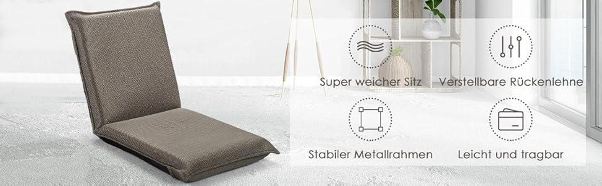 Endlich bequem am Boden sitzen! Dieser tolle Bodensessel hat eine 6-stufig verstellbare Rückenlehne und lässt sich um 360° drehen - perfekt fürs Lesen, Fernsehen oder Meditieren. Die extra dicke Polsterung sorgt für maximalen Komfort, und der robuste Stahlrahmen hält bis zu 150 kg aus. Wenn du ihn nicht brauchst, einfach zusammenklappen und platzsparend verstauen. Super praktisch für kleine Wohnungen oder Gästezimmer! Ob als Gaming-Sessel, Leseecke oder einfach nur zum Chillen - dieser Sessel ist dein neuer bester Freund. Der dunkelbraune Stoff passt in jedes Wohnzimmer und ist pflegeleicht. Mach's dir gemütlich und genieße entspannte Stunden auf Bodenhöhe!
