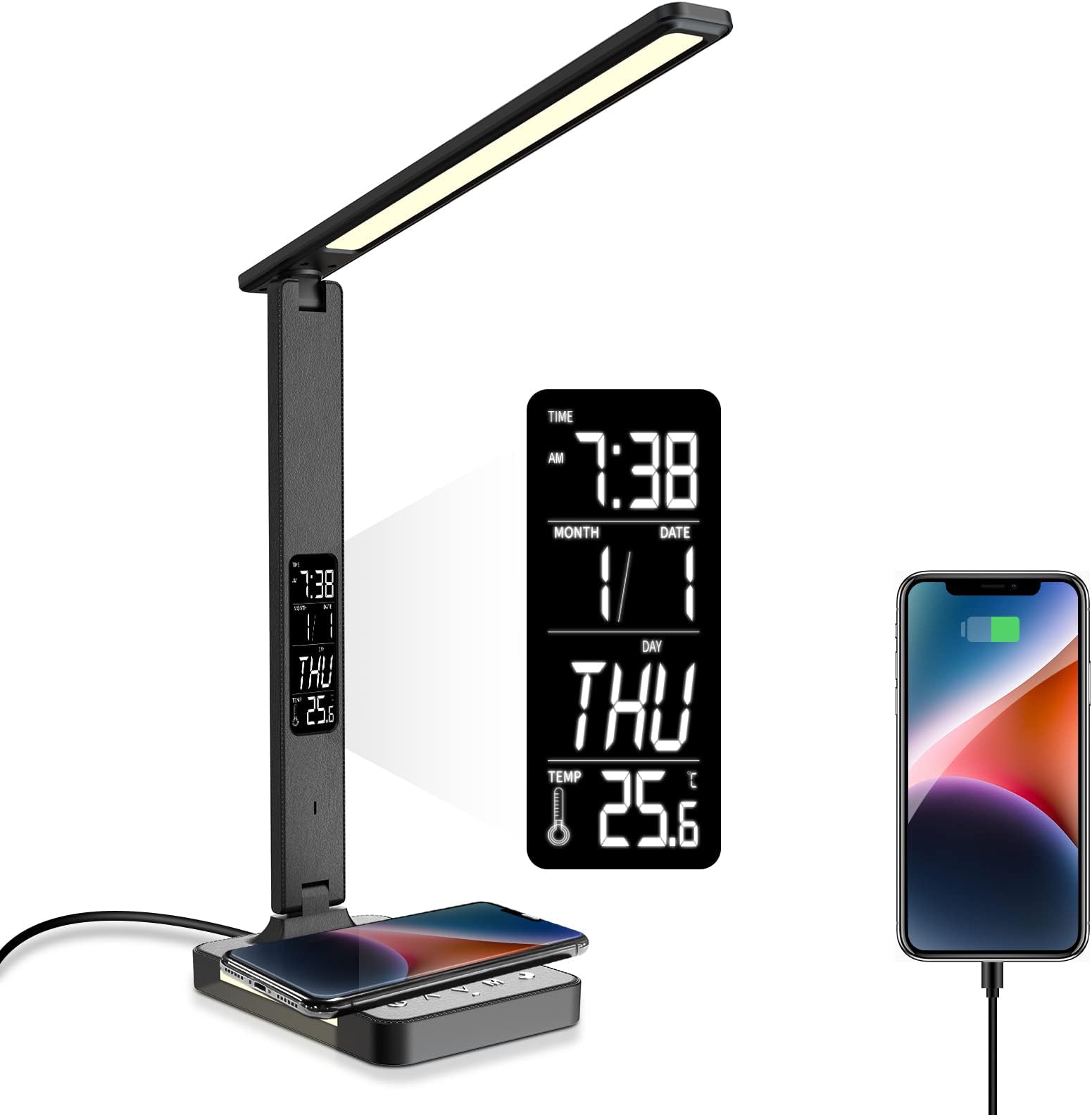 Diese Lampe ist einfach alles in einem! Sie ist nicht nur eine coole RGB-Lampe mit 8 Farbmodi und Musik-Sync, sondern hat auch einen 15W Wireless Charger und USB-Ladeanschluss. Perfekt für Gamer und Home-Office Fans! Der Schwanenhals ist voll verstellbar, das LED-Licht hat 5 Helligkeitsstufen und 3 Farbtemperaturen. Einfach per Touch steuern - total intuitiv. Mit 24x22x13cm passt sie auf jeden Schreibtisch und klappt platzsparend zusammen. Die 50.000 Stunden LED-Lebensdauer sprechen für Qualität. Ob zum Zocken, Arbeiten oder Lesen - diese Lampe rockt dein Setup!