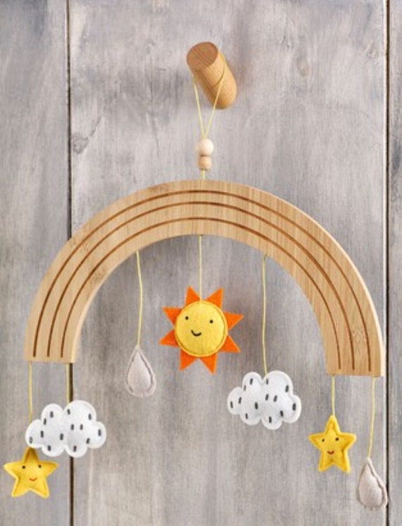 Wie süß ist denn dieses Mobile? Mit den bunten Wolken, Regentropfen und dem Regenbogen bringst du Kinderaugen zum Strahlen! Perfekt über dem Babybett oder dem Wickeltisch aufgehängt. \\n\\nAlles handgefertigt aus hochwertigem Filz und Holzperlen - absolut ungiftig und unbedenklich für dein Baby. Die Farben sind liebevoll aufeinander abgestimmt und sorgen für eine fröhliche Atmosphäre. \\n\\nNicht nur Deko, sondern auch Spielzeug: Die sanften Bewegungen und Formen fördern die visuelle Entwicklung deines Kleinen. Auch super als Foto-Hintergrund für niedliche Babybilder! \\n\\nMaße: Ideal für Standard-Babybetten, die Arme sind lang genug für gute Sichtbarkeit. Leicht genug für sichere Aufhängung, aber stabil in der Form. \\n\\nToll als Geschenk zur Geburt oder Taufe - ein persönliches Stück, das lange Freude bereitet und schöne Erinnerungen schafft!