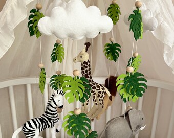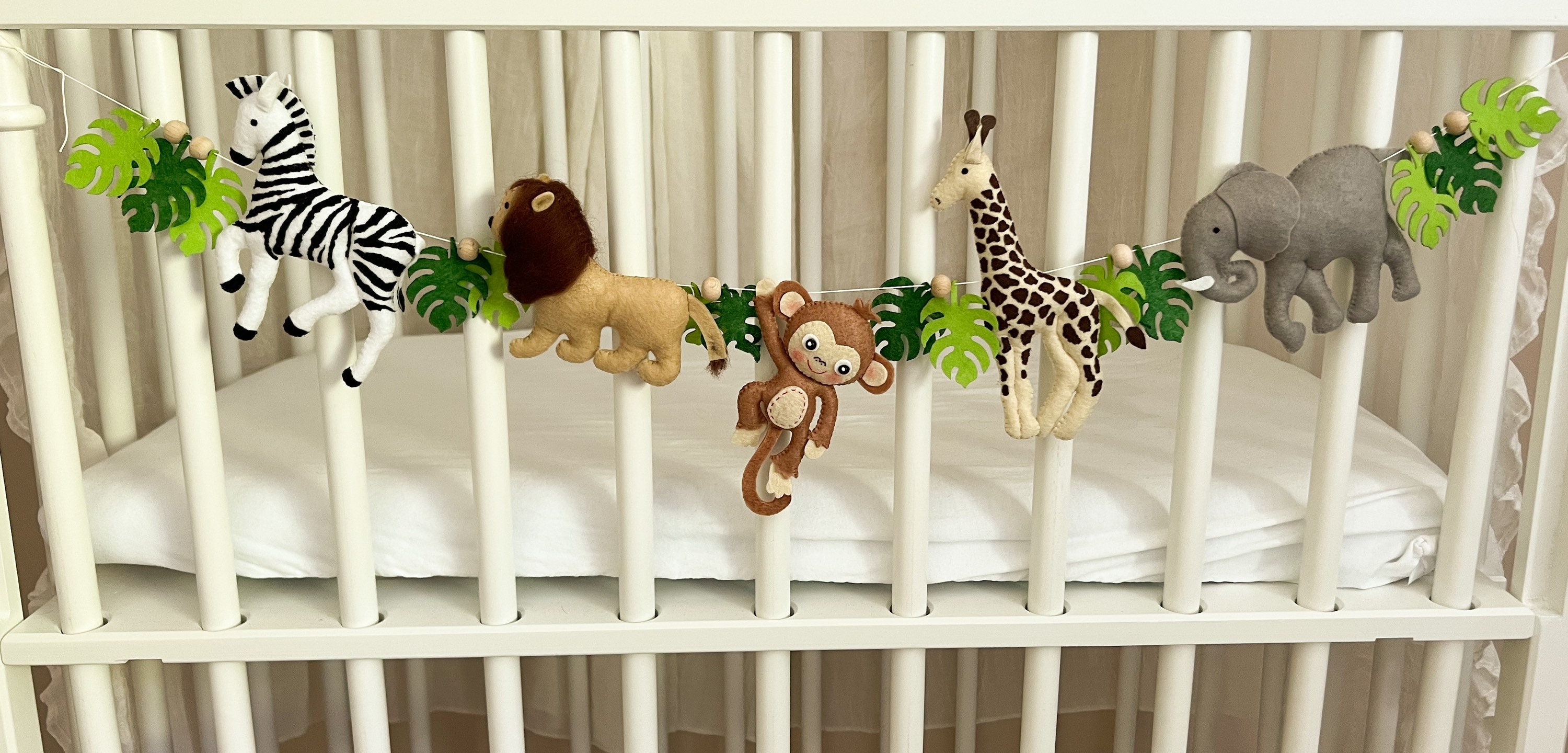 Süße Dekoration fürs Babyzimmer! Dieses niedliche Mobile mit Waldtieren - Giraffe, Löwe und Elefant - bringt Farbe und Freude ins Kinderzimmer. Handgenäht aus weichem Filz und Holz, ist es absolut sicher für dein Baby. Die grünen Blätter passen super zu jedem Einrichtungsstil. Das Mobile fördert die Konzentration deines Babys, wenn es den bunten Figuren hinterherschaut. Einfach über dem Babybett, Wickeltisch oder Kinderwagen aufhängen und dein Kleines wird begeistert sein! Es ist leicht und sicher zu montieren - kein kompliziertes Werkzeug nötig. Auch ein tolles Geschenk zur Geburt, Taufe oder zum Geburtstag! Verpackt in einer hübschen Geschenkbox kommt es perfekt an. Ob für Jungen oder Mädchen - dieses Mobile ist immer eine gute Wahl. Schaff eine gemütliche Atmosphäre im Kinderzimmer und lass dein Baby von wilden Tieren träumen! Einfach aufhängen und staunen.