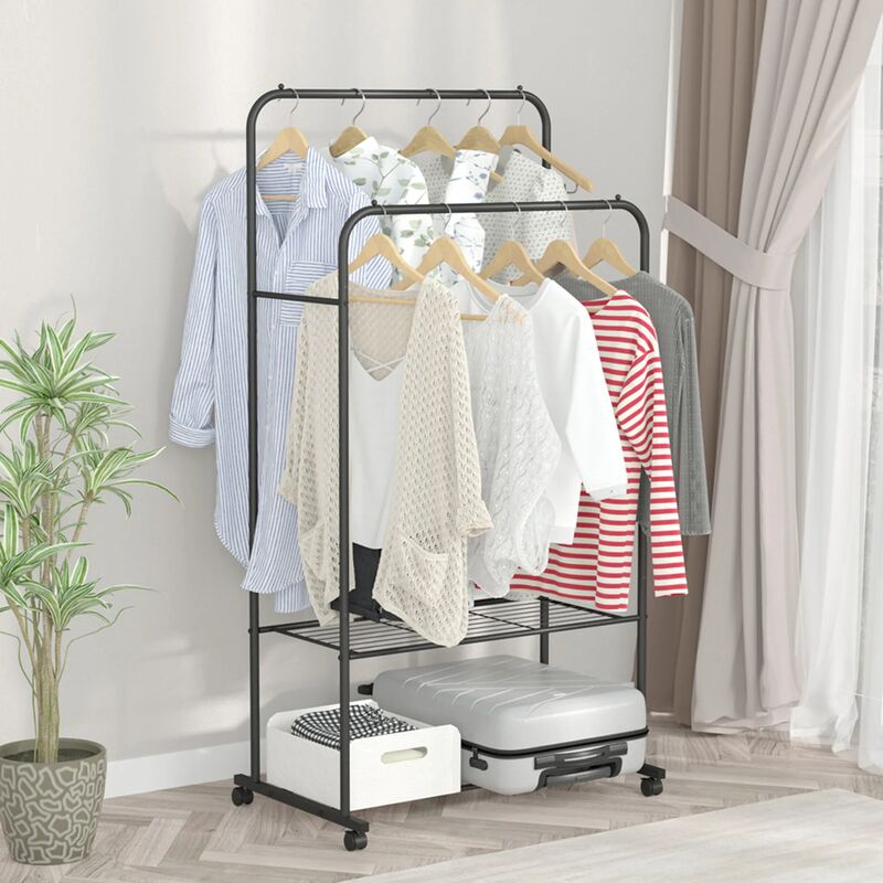 Die praktischen Rollen mit Stopp-Funktion machen ihn mobil - einfach durch den Raum schieben, wo immer du ihn gerade brauchst. Die verstellbaren Stangen passen sich deinen Bedürfnissen an, und die untere Ablage bietet Platz für Schuhe oder Taschen.