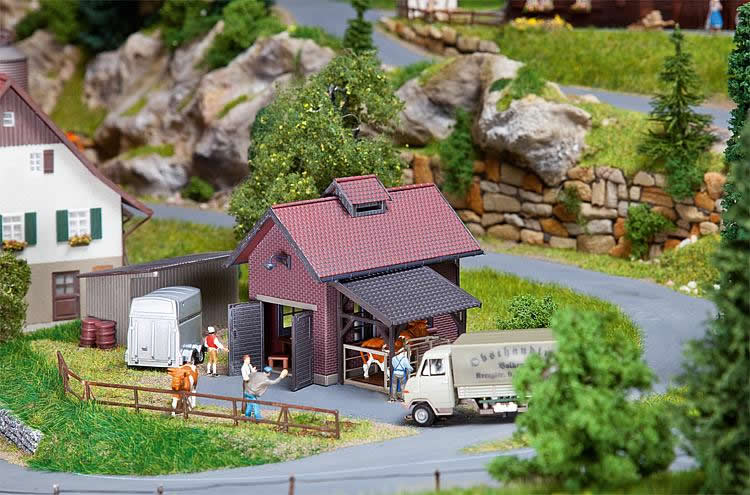 Für deine realistische Modellbahn-Landschaft! Dieses detailreiche Schlachthaus von FALLER bringt ländlichen Charme auf deine Anlage. Aus Backstein-Optik mit Flügeltor, seitlicher Überdachung und freistehendem Schuppen. Im Lieferumfang sind sogar extra Accessoires wie eine Viehwaage aus Lasercut-Material, Wurstkessel, Tisch, Fässer, Kannen und Fleischwaren - alles schon patiniert für den authentischen Look. Ein echter Hingucker für jede Landwirtschafts- oder Dorfszene. FALLER Qualität kennt jeder Modellbahner - hier stimmt einfach alles. Bau dir deine eigene kleine Welt mit diesem tollen Gebäude!