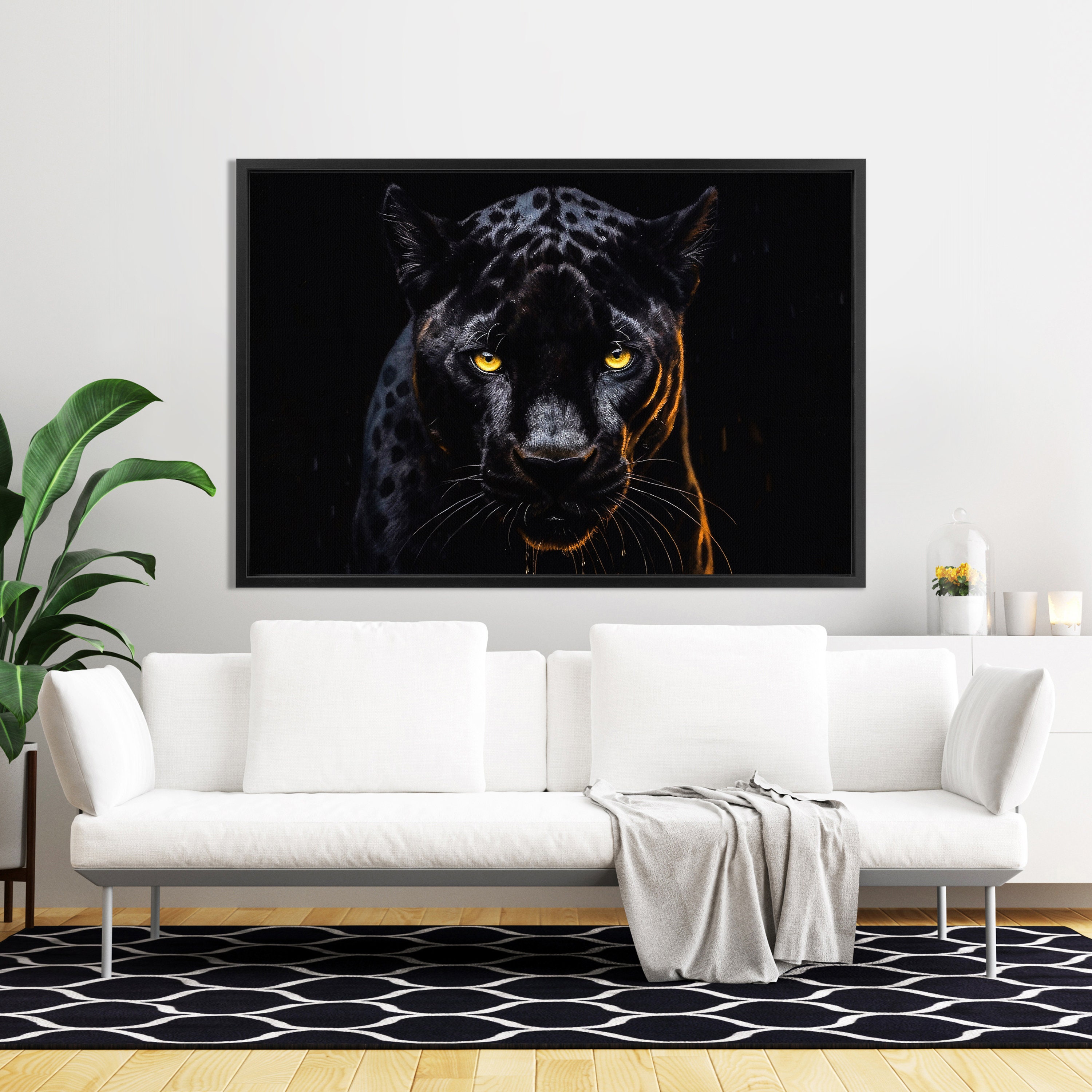 Dieses Schwarzer Panther Wandbild ist einfach der Hammer für deine Wohnung! 40x60cm groß, gedruckt auf hochwertiger Leinwand - das Motiv von einem schwarzen Panther in mystischer Mondnacht sieht einfach ultra-stylisch aus. Jedes Bild wird frisch für dich angefertigt, nicht lange gelagert, damit die Farben intensiv bleiben. Professioneller Tintenstrahldruck für gestochen scharfe Details. Perfekt fürs Wohnzimmer, Schlafzimmer oder Büro - überall da, wo du einen echten Hingucker brauchst. Wichtig: Je nach Bildschirmeinstellung können die Farben leicht abweichen, aber das Original ist garantiert hochwertig! Wird von Hand gerahmt und sorgfältig verpackt. Einfach aufhängen und deine Wände bekommen sofort mehr Persönlichkeit. Moderne Grafik, die richtig was hermacht - ob alleine oder in einer Galeriewand. Echt ein Statement-Piece für alle, die es nicht langweilig mögen!