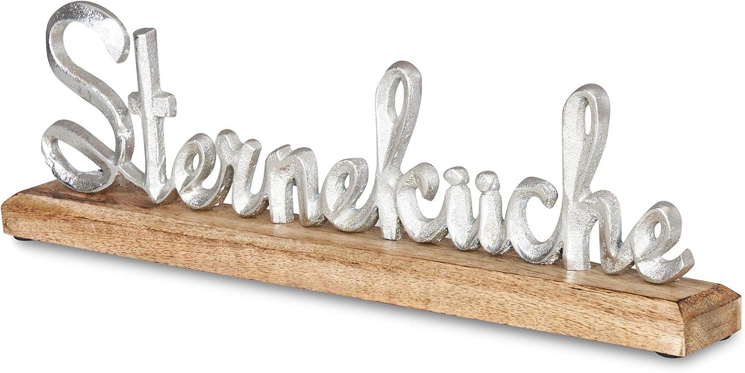 Moin! Mit diesem charmanten Schriftzug holst du dir norddeutsches Flair nach Hause. Der \Moin\-Aufsteller besteht aus weiß lackiertem Metall, das auf einem natürlichen Mango-Holzsockel befestigt ist. Mit Maßen von 33x14x5cm ist er der perfekte Blickfang für jeden Raum.