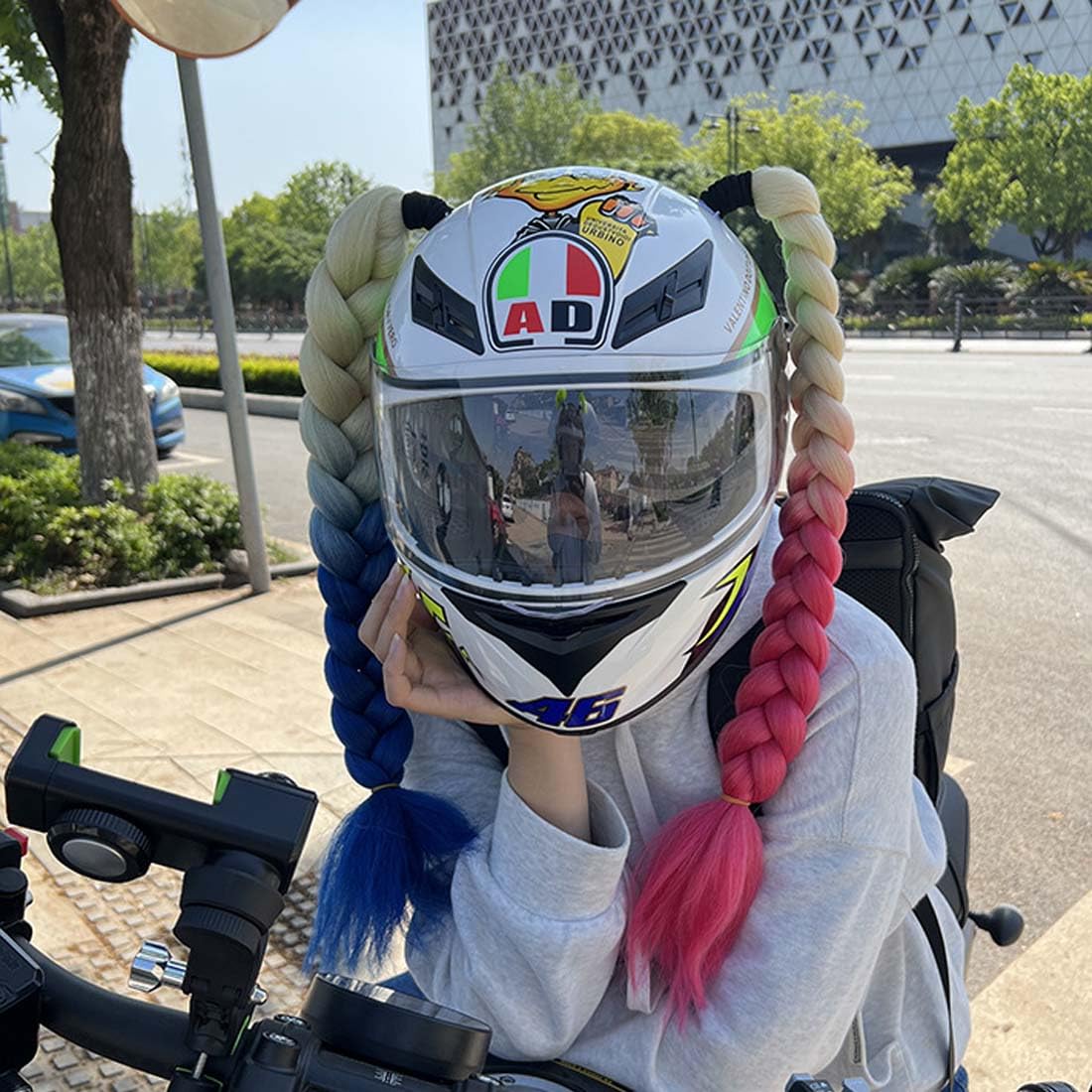 Alter Schwede, was für ein cooler Look für deinen Helm! Dieser 60 cm lange geflochtene Pferdeschwanz verwandelt deinen langweiligen Motorradhelm im Handumdrehen in ein stylisches Accessoire. Aus hochwertiger Hochtemperaturseide handgewebt, sieht er nicht nur super natürlich aus, sondern hält auch bei schnellen Fahrten problemlos stand. Die Kombination aus hellrosa und lila gibt dem ganzen einen verspielten Touch. Mit den mitgelieferten abnehmbaren Saugnäpfen und nicht markierendem Kleber bringst du die Zöpfe sicher an deinem Helm an - sie halten bombenfest, auch bei hohen Geschwindigkeiten. Das Stirnband inklusive sorgt für den perfekten Sitz. Ob für Motorrad, Ski, Fahrrad oder andere Helme - mit diesem Pferdeschwanz hebst du dich garantiert von der Masse ab. Beim Fahren wehen die Zöpfe im Wind und geben dir das ultimative Freiheitsgefühl. Einfach anbringen und den neidischen Blicken entgegenfahren!