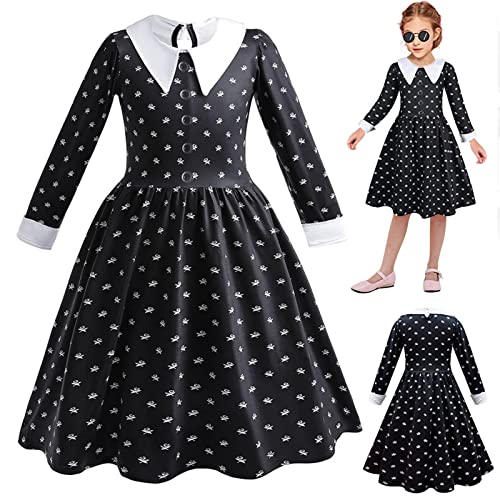 Perfekt für kleine Grusel-Fans! Dieses Mittwoch Addams Kostüm lässt Mädchen-Herzen höher schlagen. Enthält das charakteristische schwarze Kleid mit gestaffelten Ärmeln, schwarze Kniestrümpfe, Halskette und Skelett-Aufkleber. Aus weichem, nicht kratzendem Material, bequem zu tragen. In 6 Größen erhältlich - einfach Maß nehmen für die perfekte Passform. Ideal für Halloween, Cosplay-Events, Mottopartys oder Theateraufführungen. Deine Tochter wird der Star jeder Party!