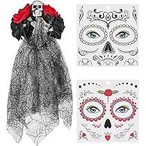 Beeindruckendes Dia De Los Muertos Kostüm für deine nächste Party! 💀 Dieses komplett Set enthält alles für den perfekten Tag der Toten Look: Einen 120cm langen Haarreif mit Schleier, 3 temporäre Gesichtstattoos im Totenkopf-Design, eine künstliche schwarze Rose, Spitze Halskette und Spitze Augenmaske - insgesamt 7 Teile! Der extra lange Haarreif (120cm statt der üblichen 80cm) kombiniert einen gruseligen Schädel mit einer eleganten schwarzen Rose. Aus hochwertigem Polyester gefertigt für bequemen Tragekomfort. Die Gesichtstattoos lassen sich leicht mit Babyöl oder Make-up-Entferner rückstandslos entfernen. Perfekt für Halloween-Partys, Karneval, Cosplay oder mexikanische Mottopartys. Mach dein Kostüm unvergesslich und sorge für garantiert Aufmerksamkeit! 🎭 Einfach anziehen und die Party rocken!