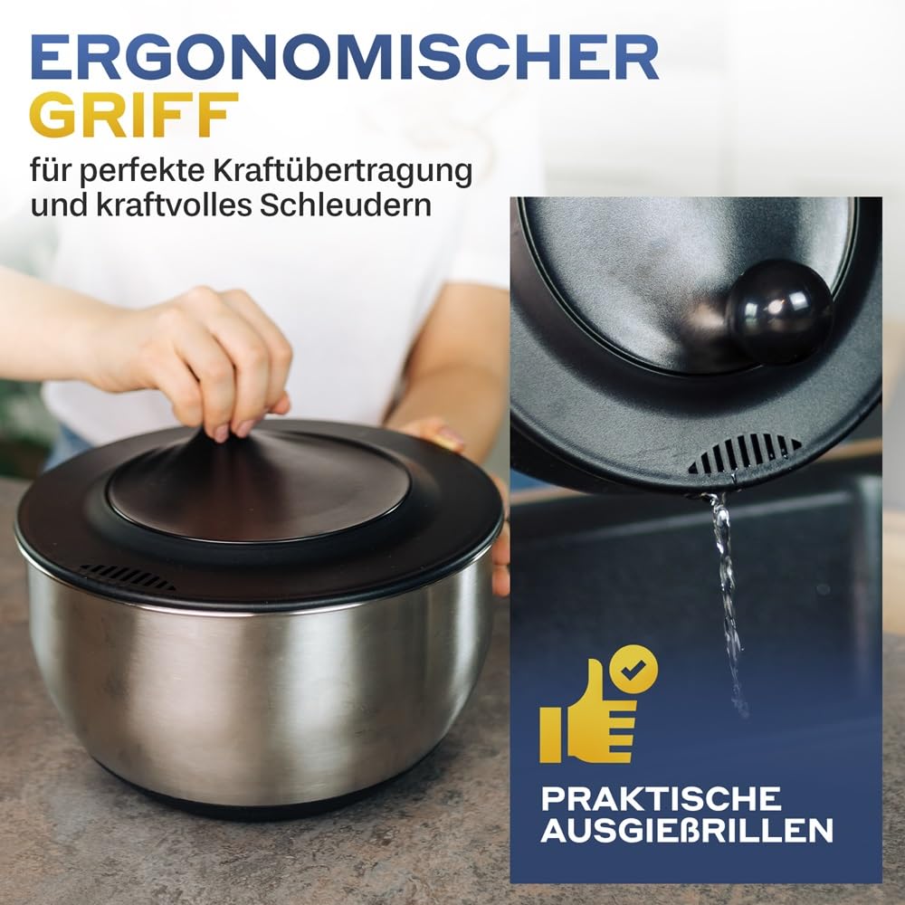 Schluss mit nassen Salatblättern! Die Kottwca Salatschleuder aus Edelstahl ist dein neuer bester Freund in der Küche. Mit vollem 5 Liter Fassungsvermögen schaffst du auch größere Mengen im Handumdrehen. Aber das ist noch nicht alles: Dieses Multitalent kommt mit 5 verschiedenen Aufsätzen und einem praktischen Eigelbtrenner. Einfach den Deckel drehen und schon wird dein Salat oder Gemüse perfekt trocken geschleudert. Aus lebensmittelechtem Edelstahl 304 gefertigt - absolut hygienisch und langlebig. Der rutschfeste Boden gibt sicheren Halt, und der praktische Bremsknopf stoppt die Rotation sofort. Nach Gebrauch einfach zerlegen und in die Spülmaschine stecken (max. 70°C). Perfekt für gesundheitsbewusste Köche, die Wert auf frische, knackige Salate legen. Ob Blattsalate, Kräuter oder fermentiertes Gemüse - mit diesem Helfer wird jede Mahlzeit zum frischen Genuss. Einfach unverzichtbar für jede moderne Küche!