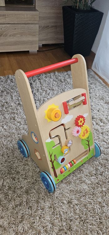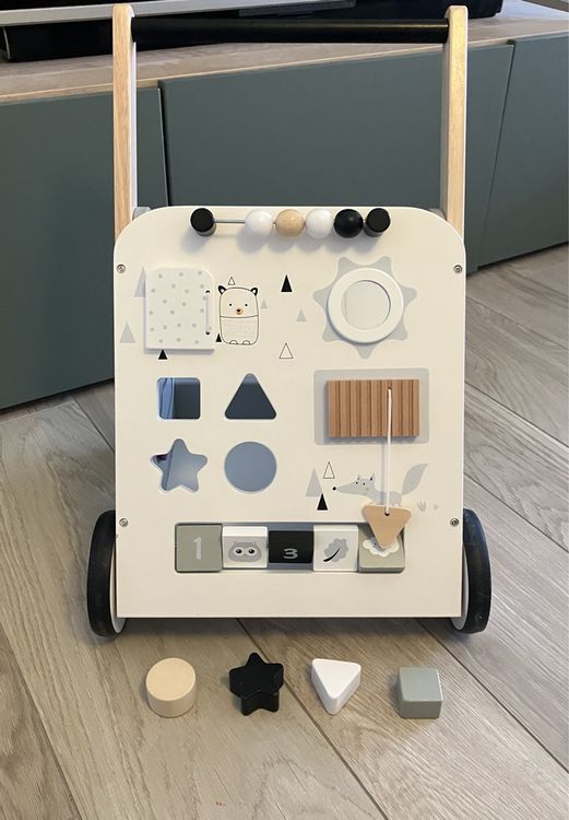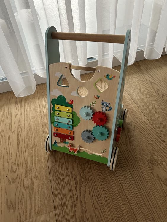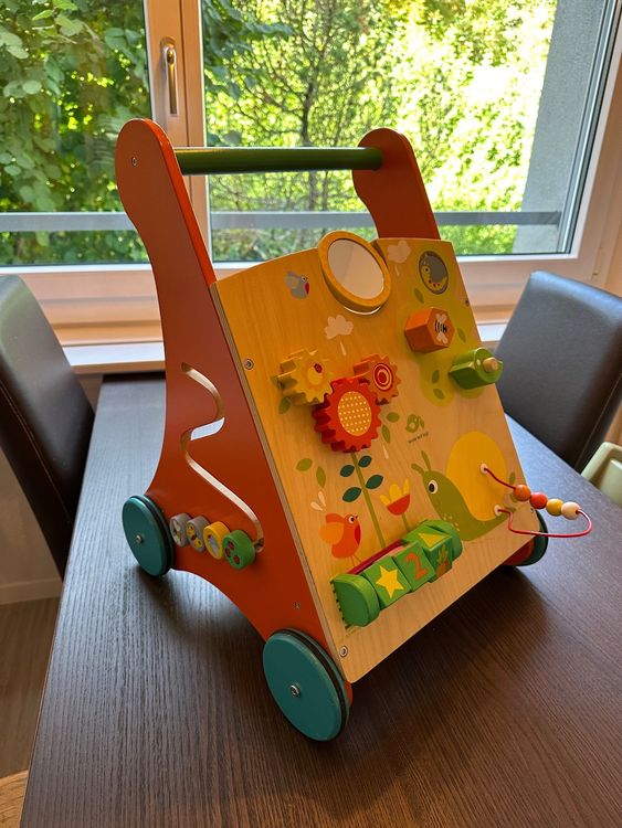 Dieser Lauflernwagen ist einfach genial! Nicht nur eine Stütze für die ersten Schritte, sondern ein ganzes Activity Center auf Rädern. Mit Xylophon, Spiegel, Formen-Puzzle, Abakus und vielem mehr - da wird's nie langweilig! Aus stabilem Birkensperrholz gefertigt, mit abgerundeten Ecken und gummibeschichteten Rädern, die deine Böden schonen. Hinten ist sogar Stauraum für Lieblingsspielzeuge. Super für die motorische Entwicklung und macht dazu noch Riesenspaß! Einfach zusammenzubauen und in mehreren Farben erhältlich. Das perfekte Geschenk für kleine Entdecker ab 1 Jahr.