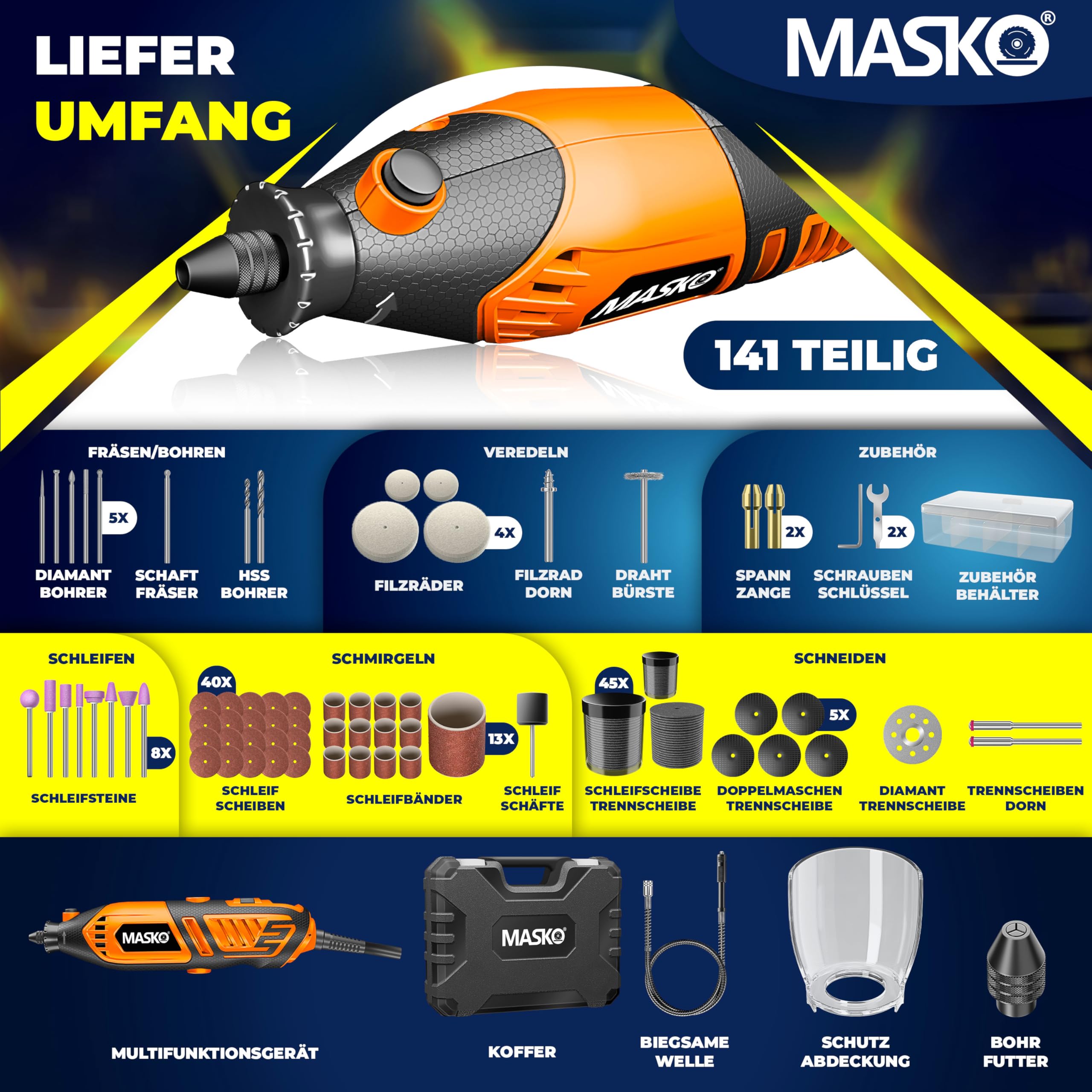 Das Schweizer Taschenmesser unter den Werkzeugen! Dieses 150W starke Multifunktionswerkzeug von HYCHIKA kommt mit 167 Teilen und meistert so ziemlich jede Aufgabe in deiner Werkstatt. Von schleifen, polieren, schneiden, bohren bis gravieren - hier ist für alles das passende Zubehör dabei. Besonders praktisch: Der integrierte Kettensägeschärfer macht stumpfe Ketten wieder rasiermesserscharf! Die 7-stufige Drehzahlregelung von 10.000-33.000 U/min gibt dir für jedes Material die optimale Geschwindigkeit. Die mitgelieferte Flexwelle erlaubt präzises Arbeiten auch an schwer zugänglichen Stellen, während der ergonomische Softgrip-Griff Ermüdung reduziert. Der austauschbare Motor und das Belüftungssystem sorgen für lange Lebensdauer und kühlen Betrieb. Mit dem integrierten Aufhängehaken hast du das Werkzeug immer griffbereit, und der robuste Aufbewahrungskoffer hält alles ordentlich zusammen. Ob für Holzarbeiten, Metallbearbeitung, Fliesen schneiden oder Heimwerkerprojekte - dieses All-in-One-Set ersetzt dir gleich mehrere Spezialwerkzeuge. Einfach das Bohrfutter mit dem beiliegenden Schlüssel festziehen und loslegen! Professionelle Ergebnisse für Heimwerker und Hobbyhandwerker - jetzt wird's ernst in deiner Werkstatt!