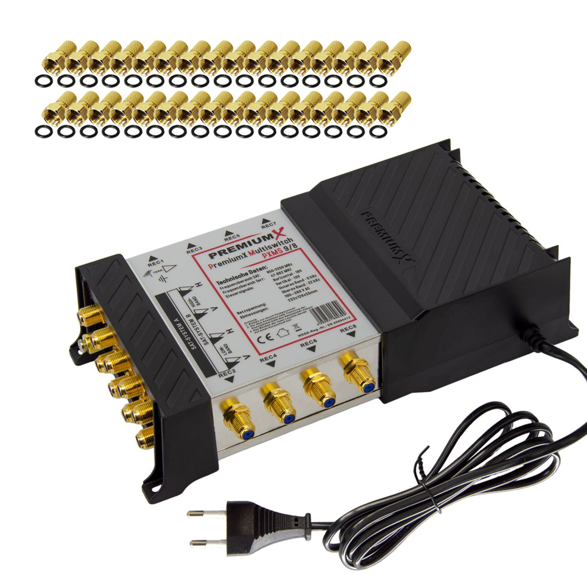 Hey, wenn du mehrere TVs mit SAT-Empfang versorgen willst, ist dieses PremiumX Set genau das Richtige! Der Multischalter 9/8 kann bis zu 8 Teilnehmer mit SAT-Signal versorgen - und das gleichzeitig! Im Paket sind zwei Quattro LNB dabei, ein Multifeedhalter und sogar 32 F-Stecker. Alles was du brauchst, um deine SAT-Anlage professionell aufzubauen! Ob Astra, Hotbird oder andere Satelliten - hier bekommst du alles rein. Mit Terr-Eingang für DVB-T2 und UKW. Das Netzteil ist schon eingebaut, also einfach anschließen und loslegen! Perfekt für Mehrfamilienhäuser oder wenn du mehrere TVs hast. Qualität made in Germany - da kannst du dich drauf verlassen!