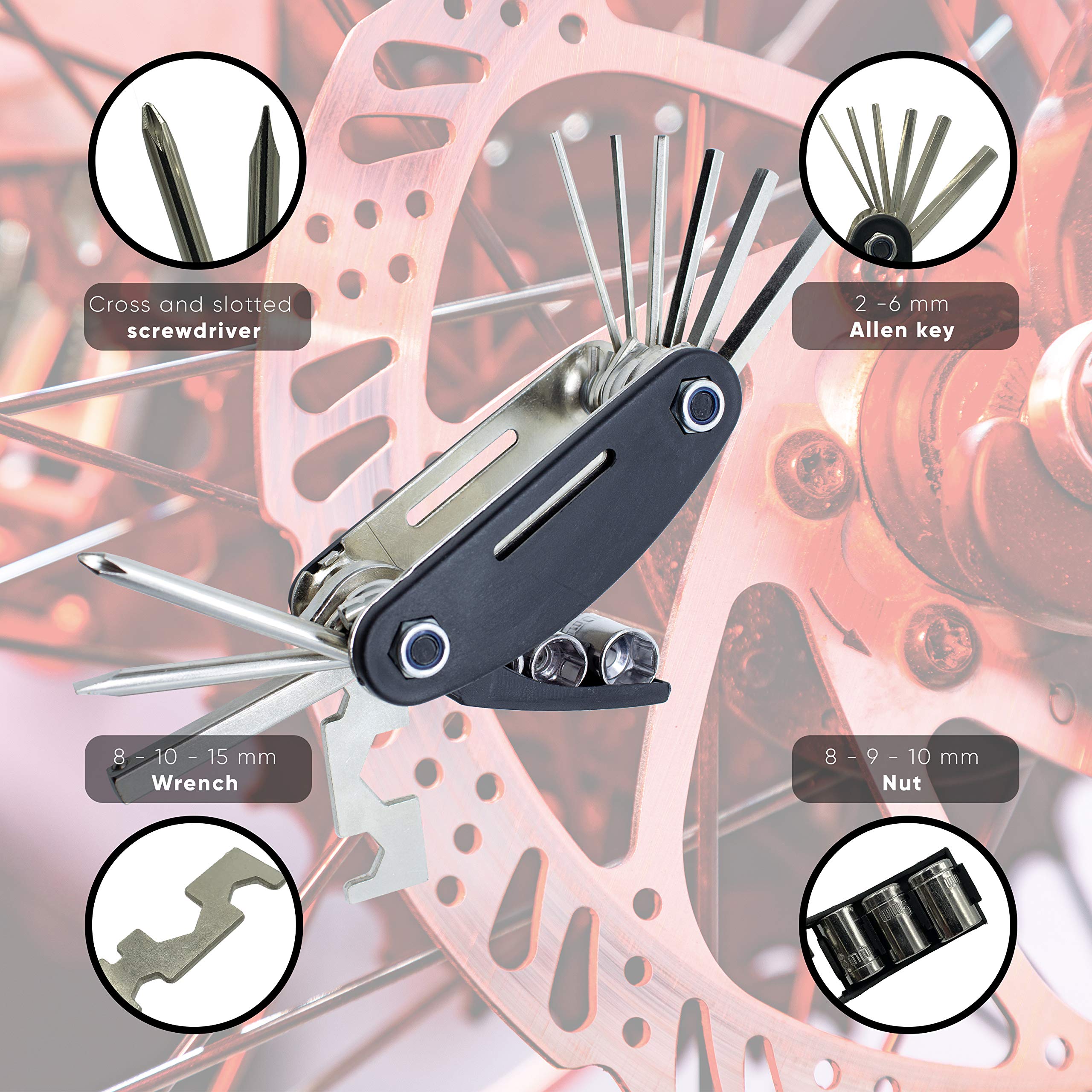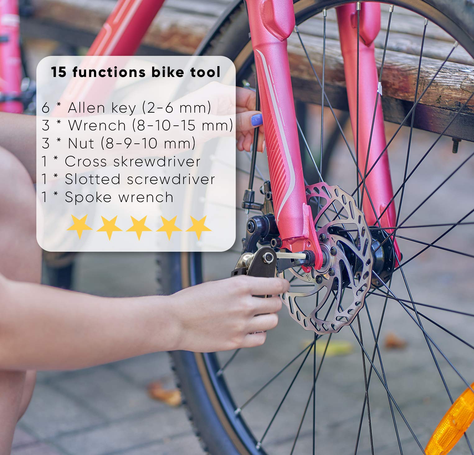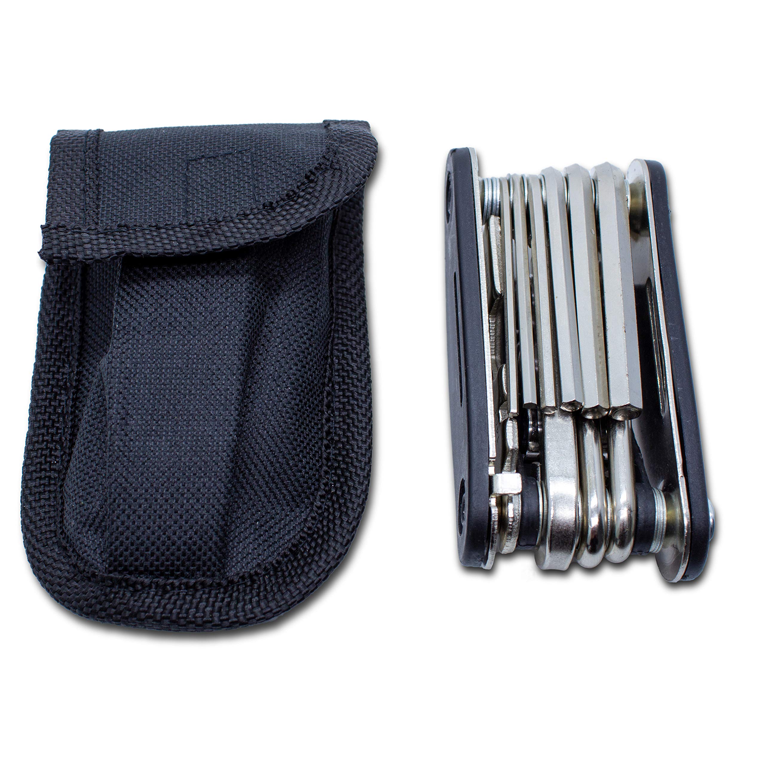Pannenhilfe always in your pocket! Das Aribari Fahrrad-Multitool mit 15 Funktionen ist dein Retter in der Not. 6 Innensechskant-Schlüssel (2-6 mm), Kreuz/Schlitz-Schraubendreher, Nüsse und Speichenschlüssel - alles dabei, was du brauchst. Klappbar und super kompakt - passt in jede Satteltasche oder Jackentasche. Mit nur 228 g kaum spürbar, aber unverzichtbar bei Reifenpannen oder lockeren Teilen. Das robuste Stahl-Chrom-Material rostet nicht und hält ewig. Inklusive praktischer Transporttasche - geschützt vor Schmutz und Feuchtigkeit. Ideal nicht nur für Fahrräder, sondern auch für E-Bikes, Roller und andere Sportgeräte. Einfache Handhabung - auch für Nicht-Profis geeignet. Nie wieder hilflos am Straßenrand stehen! Perfekt für Touring, Mountainbiking oder den Stadtverkehr. Qualität, die überzeugt - von der Verarbeitung bis zum Finish. Dein bester Begleiter auf allen Fahrrad-Abenteuern! Ein Must-Have für jeden, der gerne unabhängig unterwegs ist.