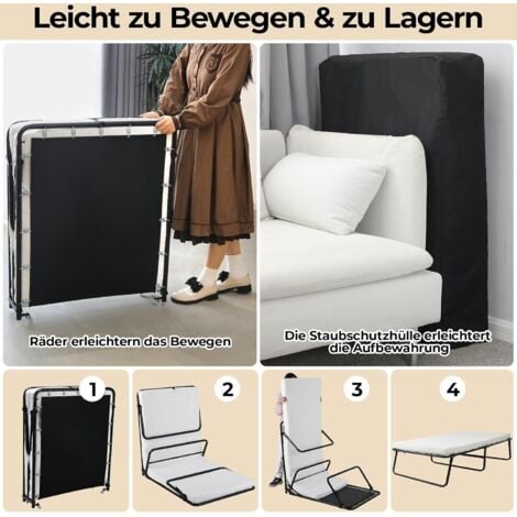 Platzsparende Lösung für Gäste oder beengte Wohnverhältnisse! Dieses MUTUN Klappbett mit 90x190cm Größe bietet komfortable Schlafgelegenheit bei Bedarf. Mit 12cm dicker Matratze aus Memory-Schaum und Stützschaum für optimalen Liegekomfort. Stahlrahmen mit verstärktem Metallgitter - hält bis 250kg stand. Einfach zusammenzuklappen und mit Rädern mobil. Inklusive Staubschutzbezug und Ablagefach für Handy, Brille etc. Mit Klettverschlüssen für sicheren Matratzenhalt. Perfekt für Gästezimmer, Büro oder kleine Wohnungen. Einfache Montage - in ca. 2 Stunden aufgebaut. Hol dir dieses praktische Klappbett für flexible Schlafmöglichkeiten!