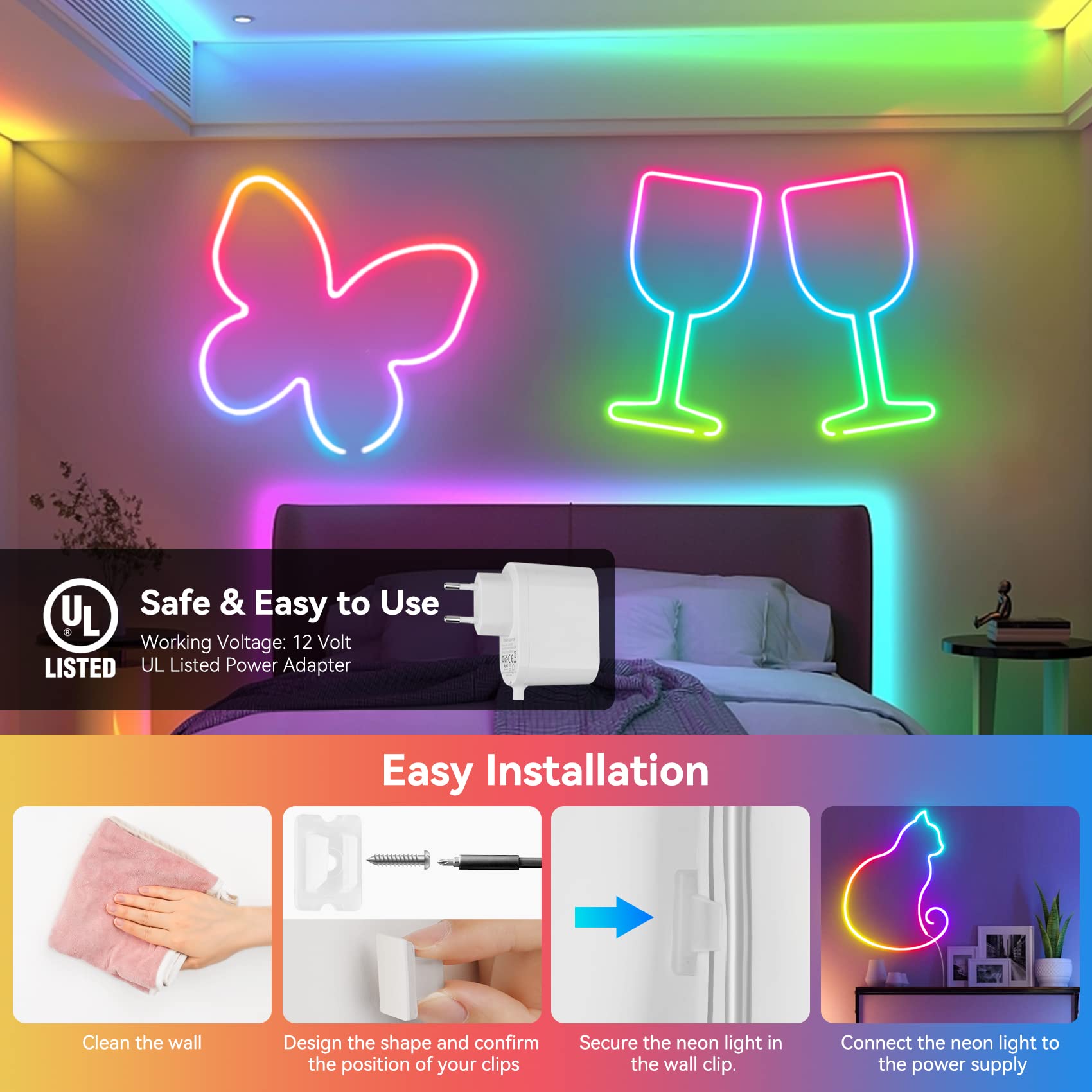 Mit nur 5V Betriebsspannung bleibt der Streifen immer kühl und verbraucht kaum Strom. Das weiche Silikon-Material ist absolut sicher und kann beliebig gebogen werden. Und wenn du ihn mal ausschaltest - kein Problem, er merkt sich deine letzte Einstellung!