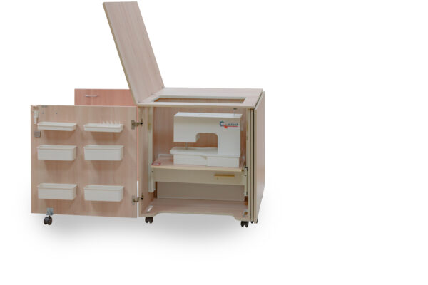 Hallo Näh-Begeisterte! Dieser Comfort 6 Nähmaschinenschrank ist dein neuer bester Freund! Mit dem praktischen Air-lift-System kannst du deine Nähmaschine (bis 10kg) ganz easy hoch- und runterfahren. Größe M in schönem Oak Kendal Cognac - passt in jedes Zimmer. Super viel Stauraum: 8 große und 4 kleine Aufhängekästen, 2 Spulenständer für 12 Spulen, 1 großer für 56 Spulen, 1 kleiner Sektionskasten und 3 Schubladen! Mit 14 Rädern (4 mit Sicherung) ist er mobil und standsicher. Perfekt für Overlock-Maschinen bis 10kg. Wird zerlegt geliefert - Montageanleitung ist dabei. Endlich alles an einem Platz: Nähmaschine, Garn, Scheren, Stoffe - du findest alles sofort! Macht dein Näh-Hobby gleich viel organiserter und spaßiger. Ein richtiger Profi-Schrank für Hobby-Näherinnen!