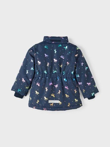 Stylish in den Herbst! Diese wunderschöne Jacke von NAME IT macht jedes Mädchen zur kleinen Fashionista. Mit dem trendigen Allover-Print und der praktischen abnehmbaren Kapuze ist sie perfekt für die kühleren Tage geeignet. Die Jacke hat tolle Details wie reflektierende Elemente für mehr Sicherheit in der Dämmerung, elastische Ärmelbündchen für optimalen Sitz und einen Kinnschutz am Reißverschluss, der vor unangenehmen Berührungen schützt. Die Polyester-Füllung wärmt angenehm, ohne zu beschweren. Besonders praktisch: Die ECO wasserabweisende Behandlung kommt ohne fluorhaltige Substanzen aus - gut für dein Kind und die Umwelt! Der Reißverschluss schließt leicht, und die seitlichen Taschen bieten Platz für kleine Schätze. Perfekt für Kindergarten, Spielplatz oder Spaziergänge - diese Jacke ist ein echter Allrounder für den Herbst!