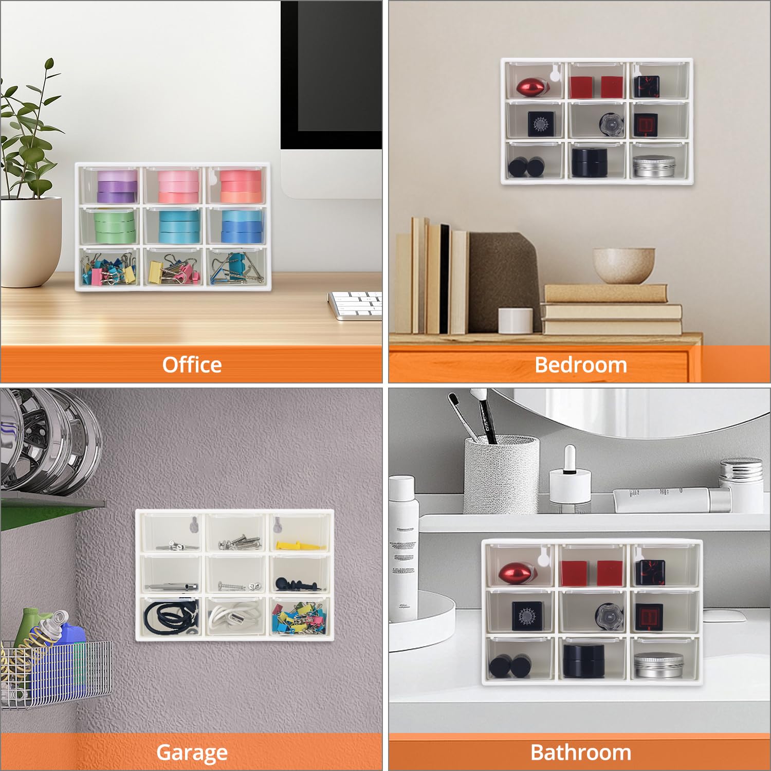 Maße: 18x12x10cm pro Box - kompakt aber geräumig. Aus stabilem weißem Kunststoff mit durchsichtigen Schubladen, damit du sofort siehst, was wo liegt. Super zum Stapeln, perfekt für Schreibtisch, Werkbank oder Regal.