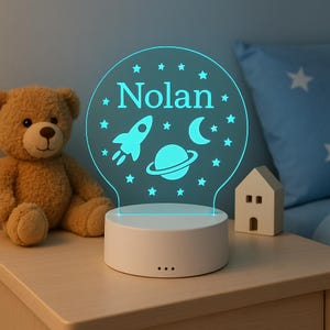 Magisches Astronauten-Raketen-Nachtlicht fürs Kinderzimmer! In 3D-Optik - sieht aus wie eine echte Raumfähre! In zwei Größen erhältlich: A5 (klein) und A4 (groß)! Made in France - hochwertige Lasergravur! Expressbearbeitung - innerhalb 24 Stunden produziert! Perfekt als Nachtlicht für ängstliche Kinder! Schafft eine beruhigende Atmosphäre im Zimmer! Ideal als Geschenk für Jungs von 4-10 Jahren! Einfach personalisierbar - besondere Aufschrift möglich! Macht jedes Kinderzimmer zum Abenteuer-Universum! Einfach anschalten und ins Weltall träumen!