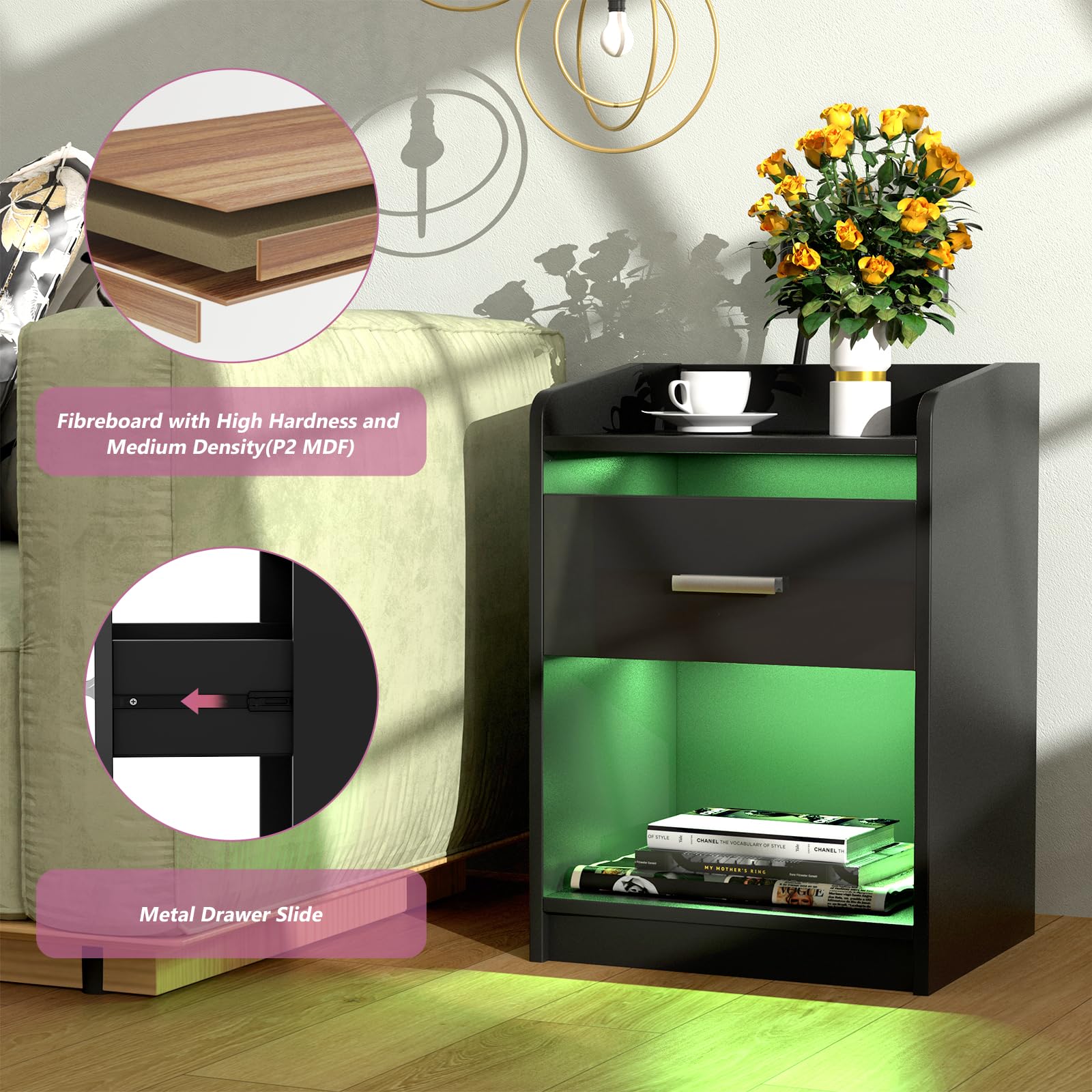 Dieses DHHOZAMZ Nachttisch-Set ist einfach genial für modernes Wohnen! Im 2er-Set bekommst du zwei praktische Nachttische in schwarz, je 45x35x52cm groß - also perfekt für kleine Räume. Das Highlight: Integrierte LED-Beleuchtung mit Fernbedienung! Du kannst zwischen verschiedenen Farben und Helligkeitsstufen wechseln. Noch praktischer: Jeder Tisch hat 2 AC-Steckdosen und 2 USB-Anschlüsse - dein Handy kann direkt neben dem Bett laden! Mit zwei geräumigen Schubladen für Bücher, Brille, Cremes und Kleinkram. Die Oberfläche ist groß genug für Lampe, Wecker und Getränk. Super einfach zu montieren - alle Teile sind beschriftet und die Anleitung ist verständlich. Sieht total edel aus mit dem Hochglanz-Finish. Perfekt fürs Schlafzimmer, aber auch als Beistelltische im Wohnzimmer. Mach dein Schlafzimmer smart und stylisch!