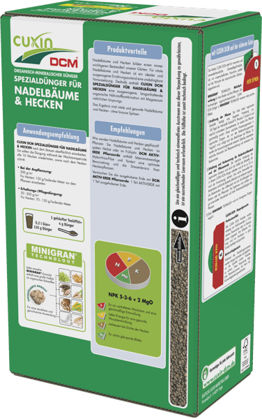 Deine Nadelbäume und Hecken sehen nicht mehr so vital aus? Der CUXIN DCM Spezialdünger bringt sie wieder in Form! Mit der innovativen MINIGRAN Technology - jedes Körnchen enthält alle Nährstoffe gleichmäßig verteilt. Bio-zertifiziert und für den ökologischen Landbau geeignet. Enthält Magnesium gegen braune Nadelspitzen und wirkt bis zu 3 Monate lang. Einfach ausstreuen - entweder von Hand oder aus der praktischen Streuschachtel. Für gesunde, widerstandsfähige Pflanzen, die auch extreme Witterung gut wegstecken. Dein Garten wird's dir danken!